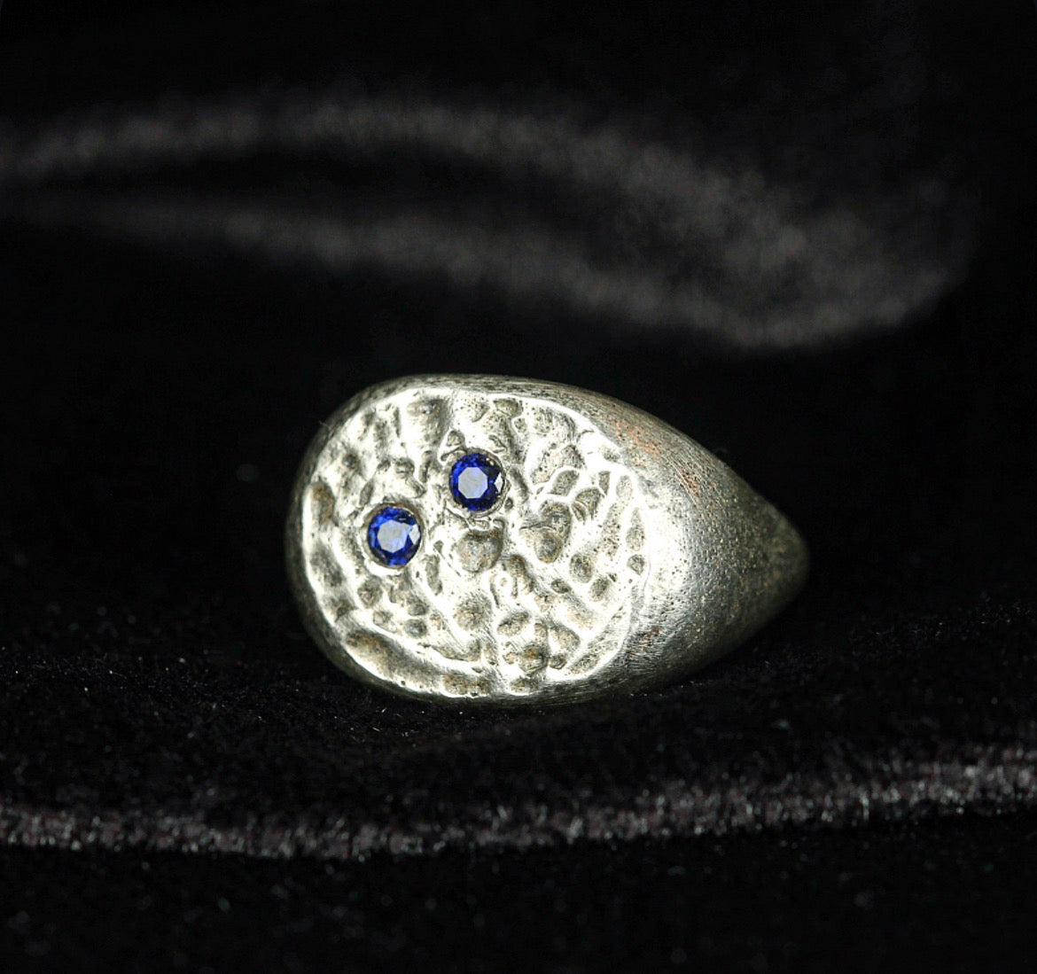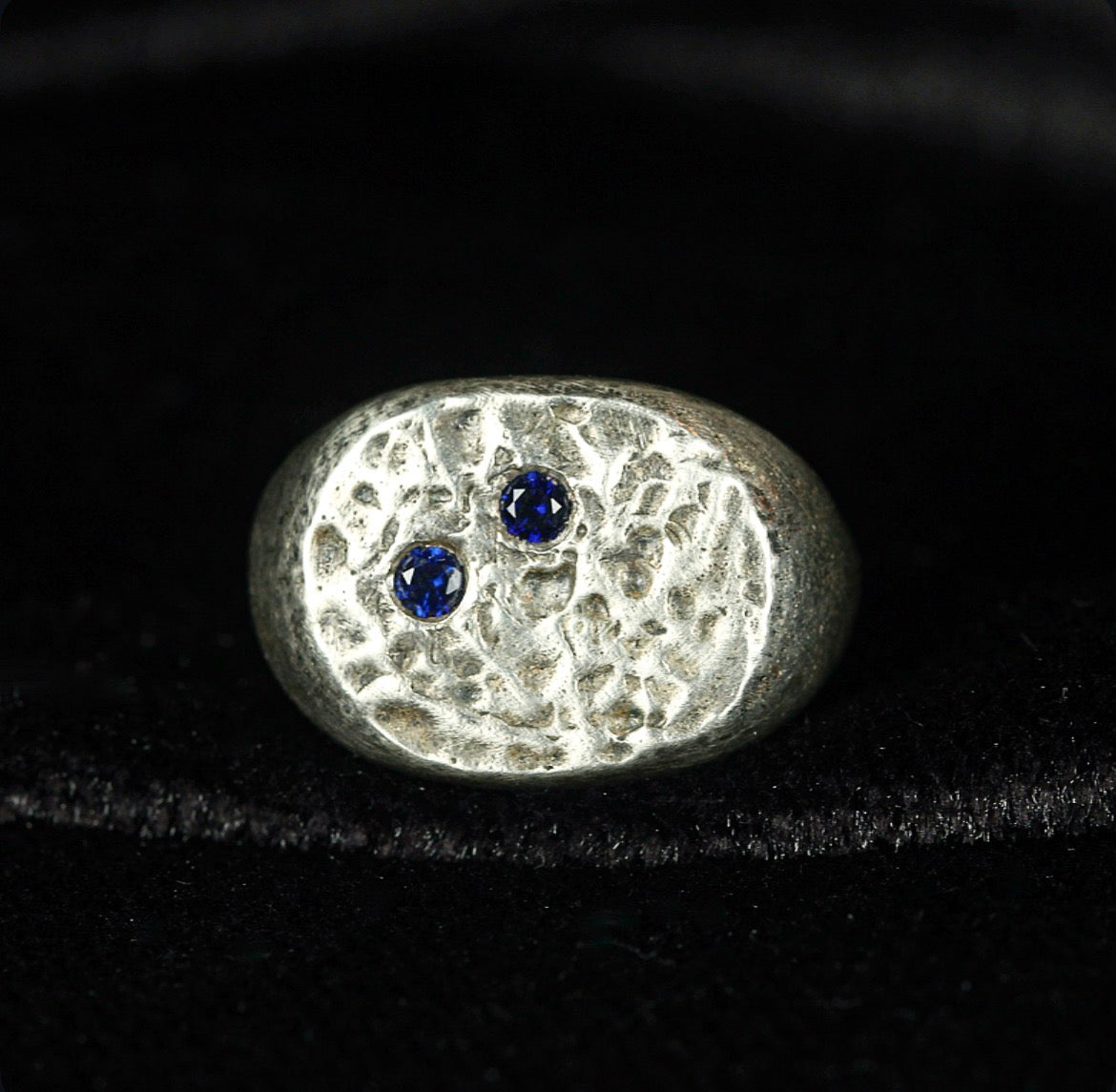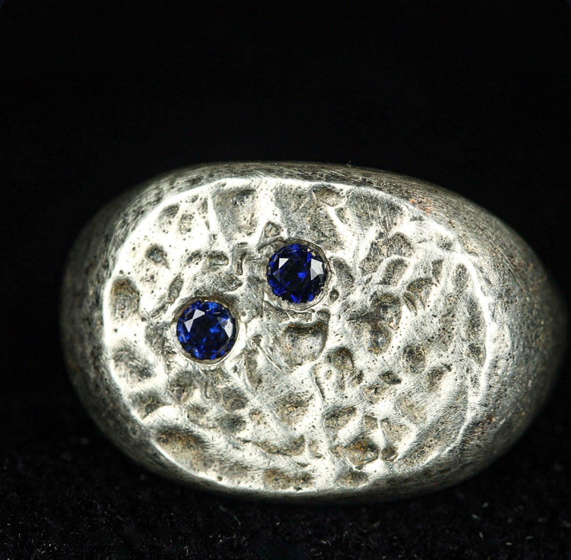 Two blue sapphires remain embedded quiet points of tension within the mass.