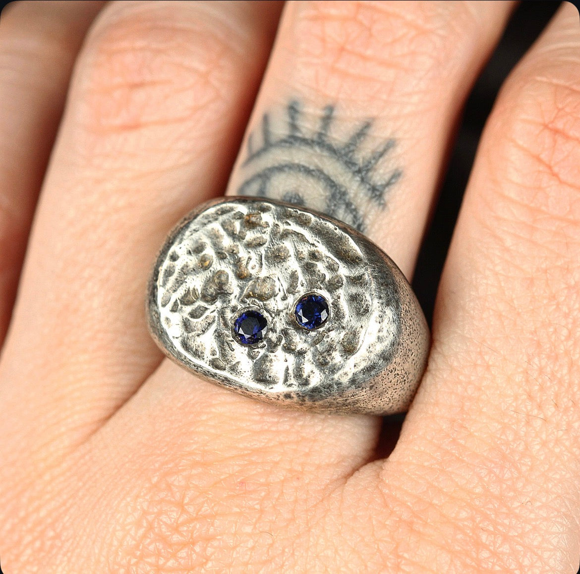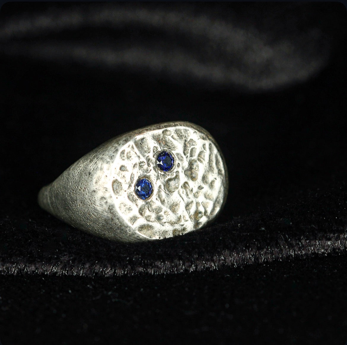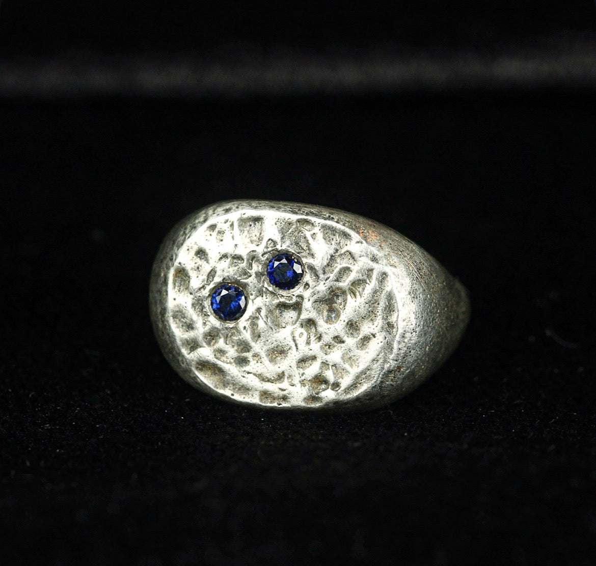 Two blue sapphires remain embedded quiet points of tension within the mass.