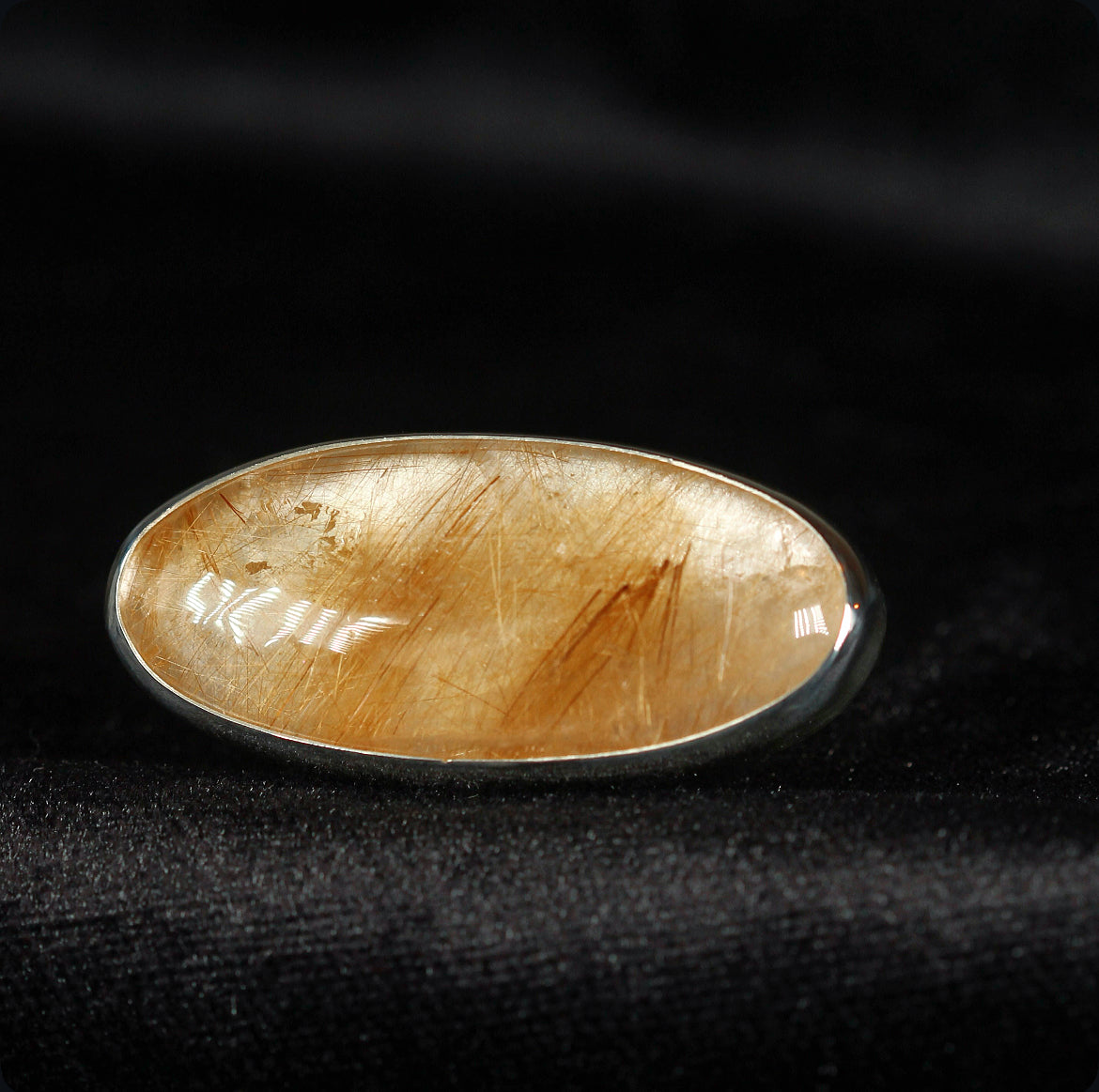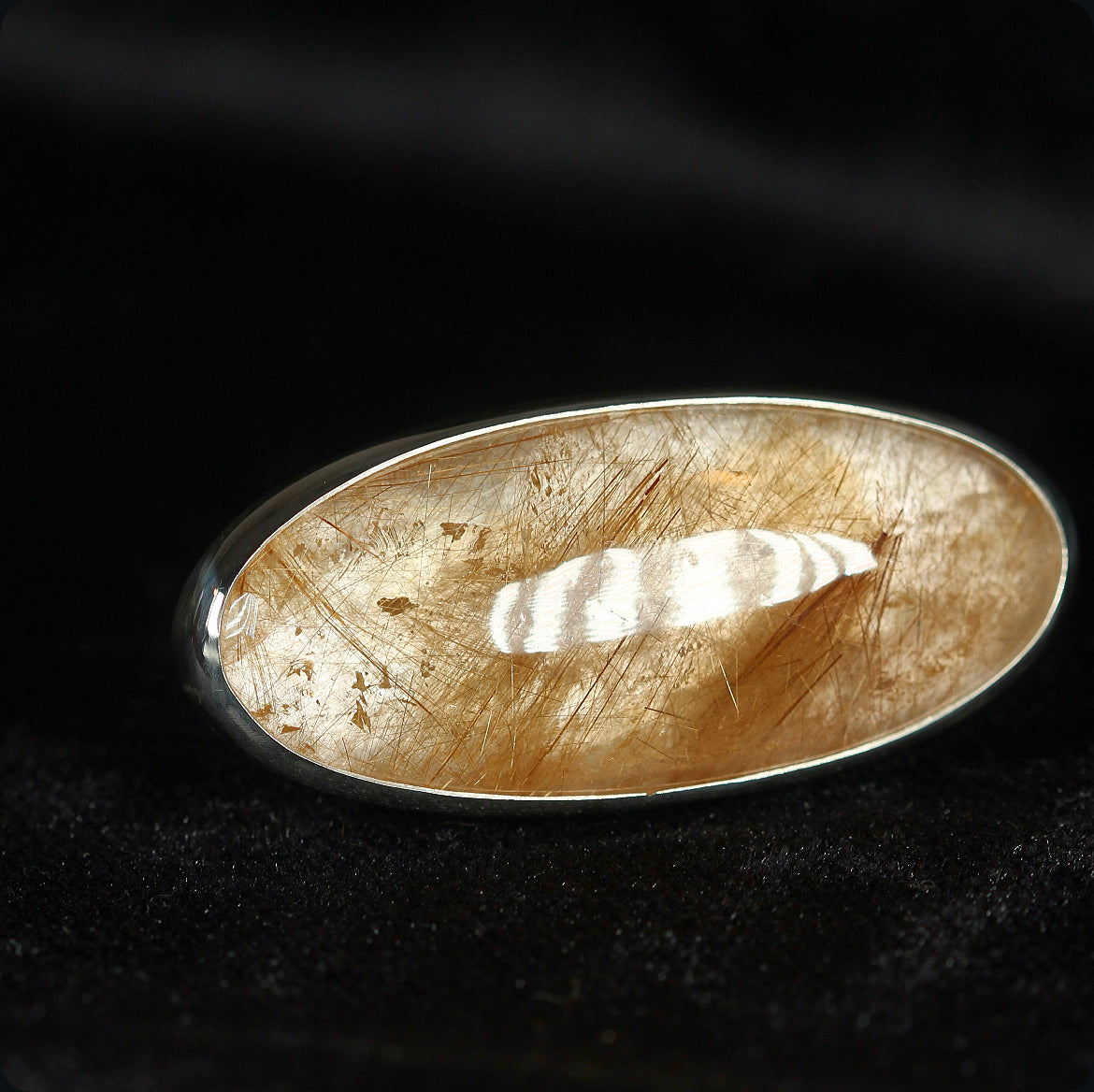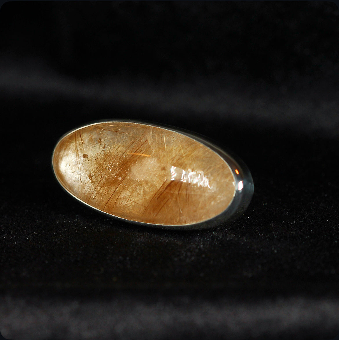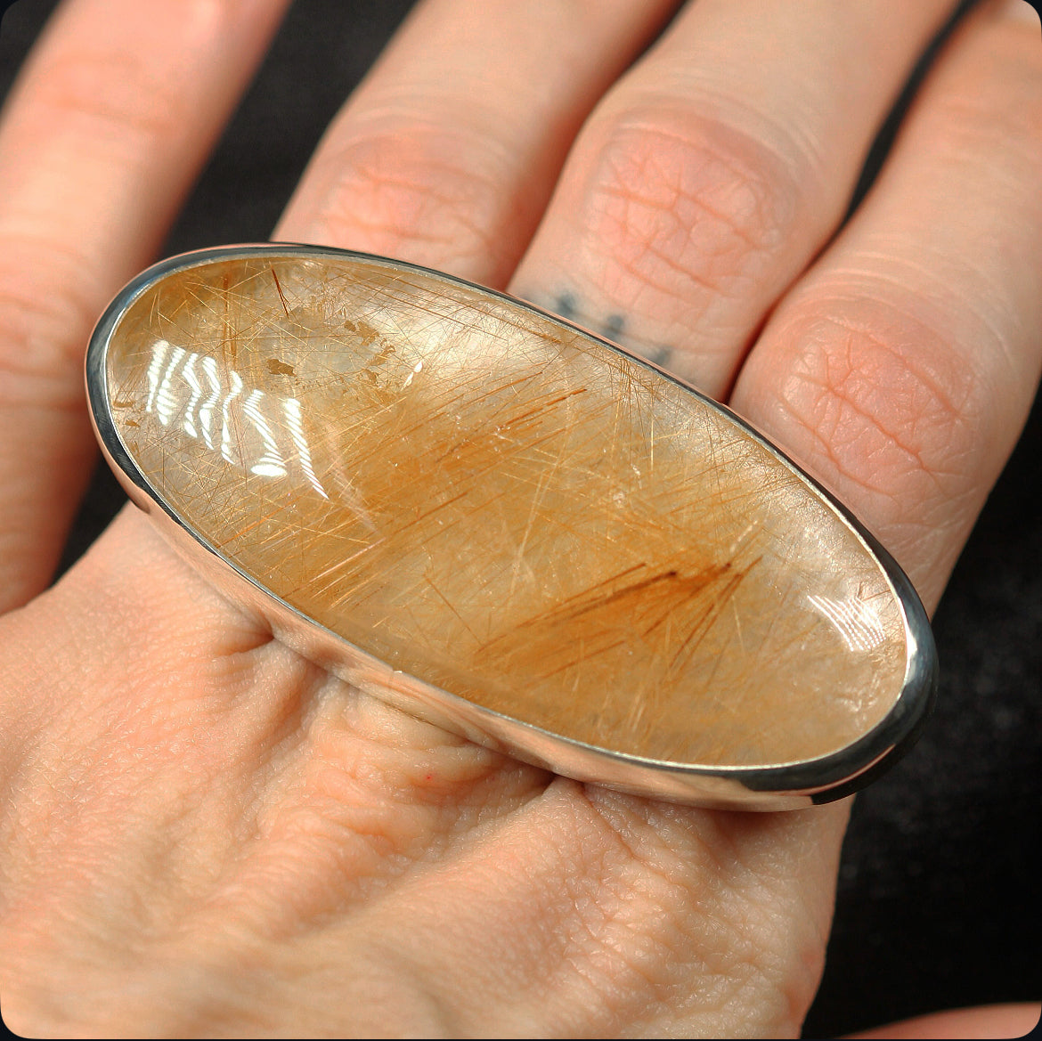 This statement ring showcases the raw beauty of rutilated quartz in its grandest form. Golden needles are locked within the stone like silent lightning, radiating both power and elegance. Set in sterling silver with an adjustable band, this one of a kind piece is designed to stand out.