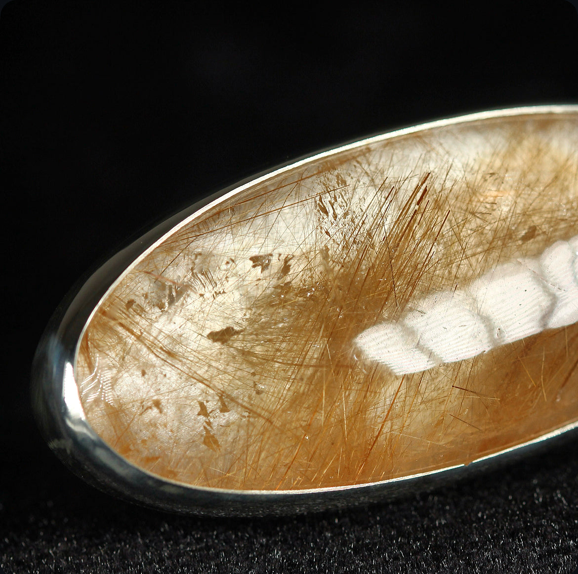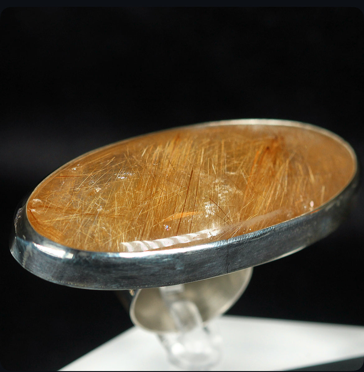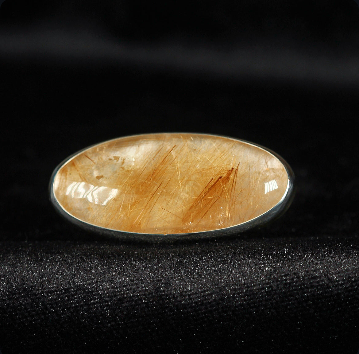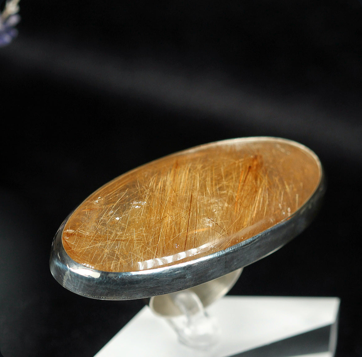 This statement ring showcases the raw beauty of rutilated quartz in its grandest form. Golden needles are locked within the stone like silent lightning, radiating both power and elegance. Set in sterling silver with an adjustable band, this one of a kind piece is designed to stand out.