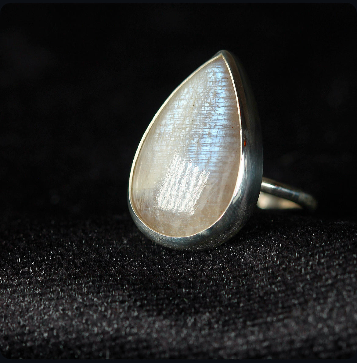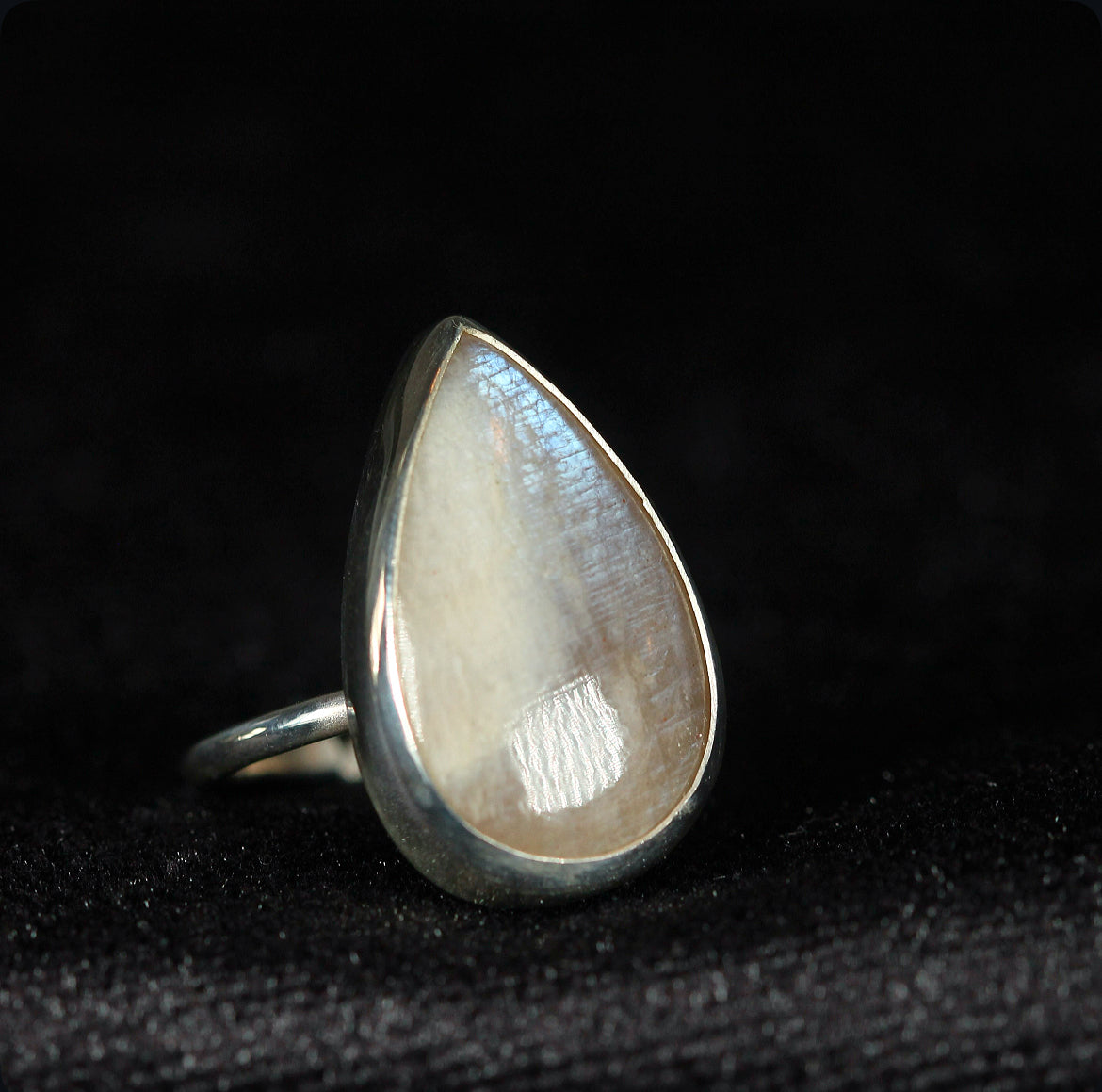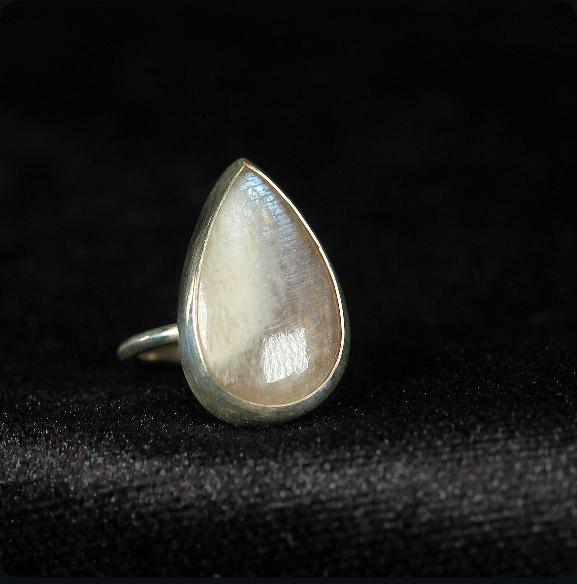 A teardrop of light captured in silver. This adjustable ring features a rare belmorite moonstone with an ethereal shimmer that shifts with every movement. Handcrafted in 925 silver, its pear shaped stone evokes both softness and strength a piece that feels timeless, yet singular.
