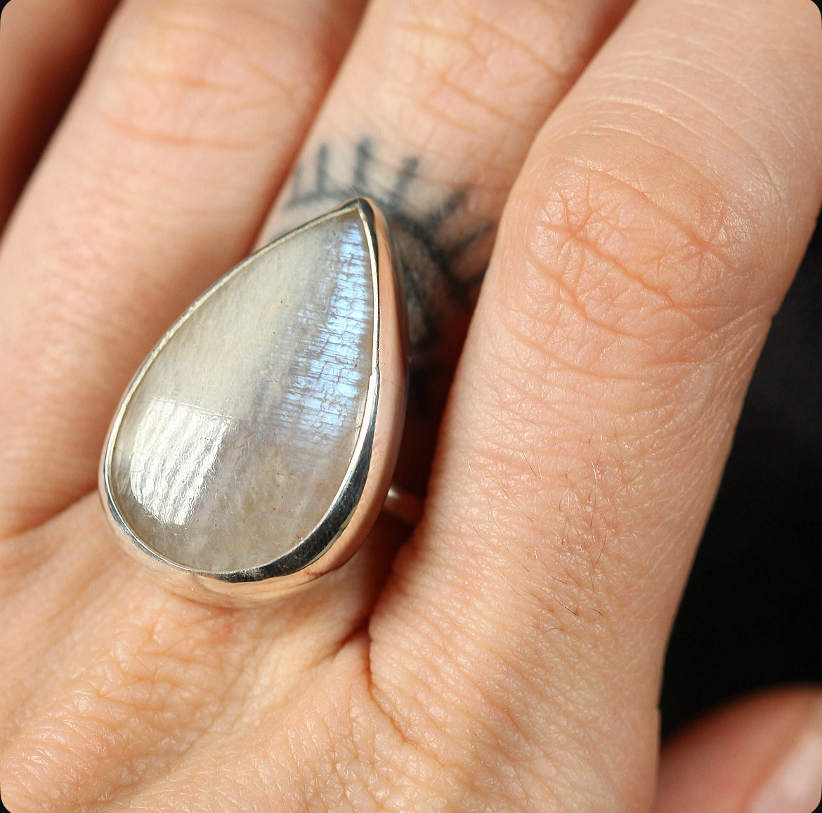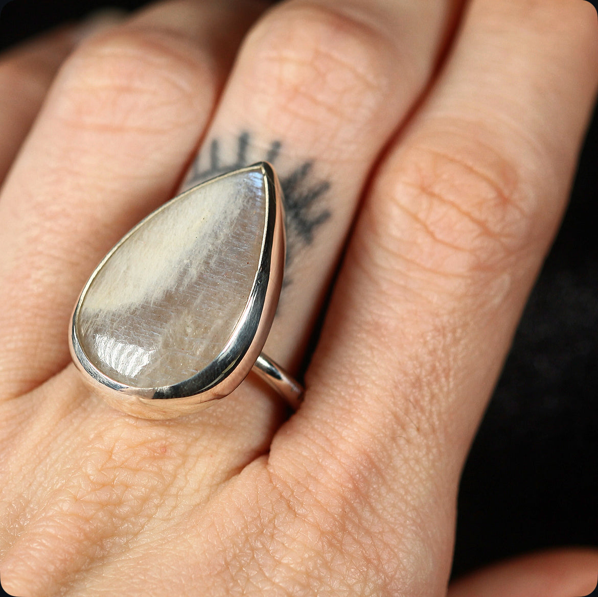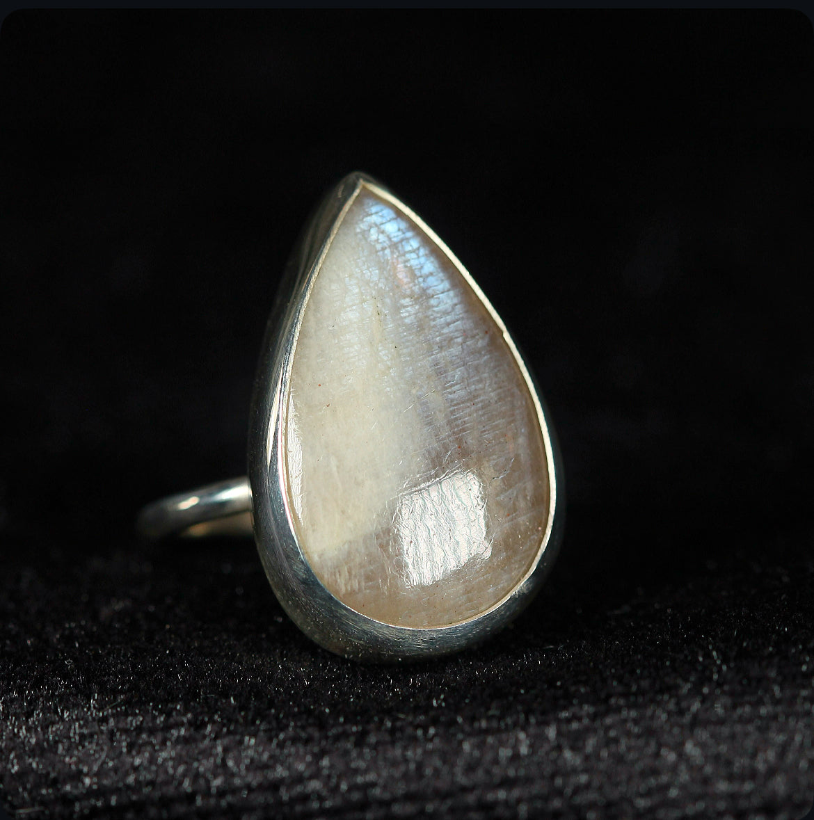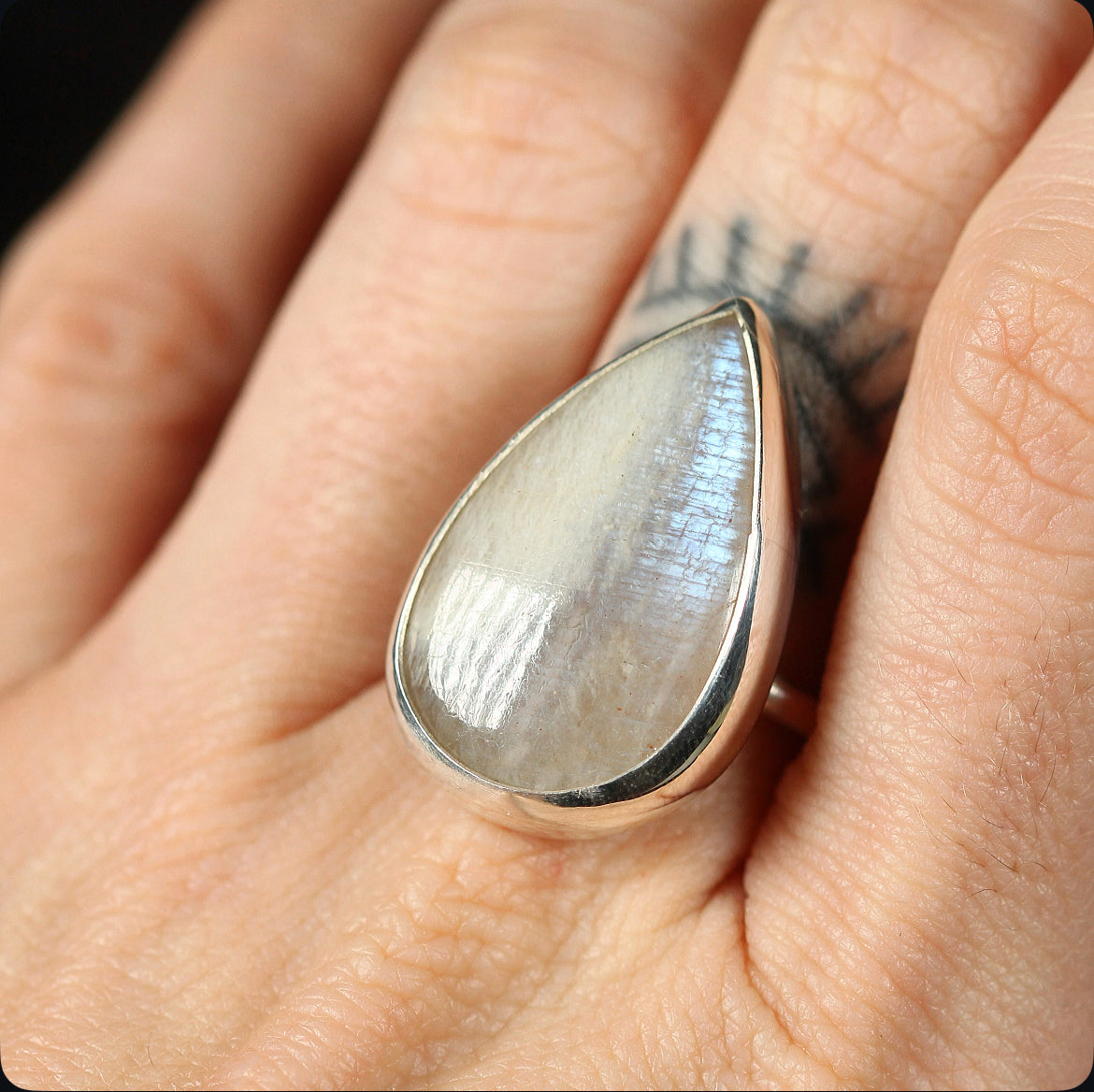 A teardrop of light captured in silver. This adjustable ring features a rare belmorite moonstone with an ethereal shimmer that shifts with every movement. Handcrafted in 925 silver, its pear shaped stone evokes both softness and strength a piece that feels timeless, yet singular.
