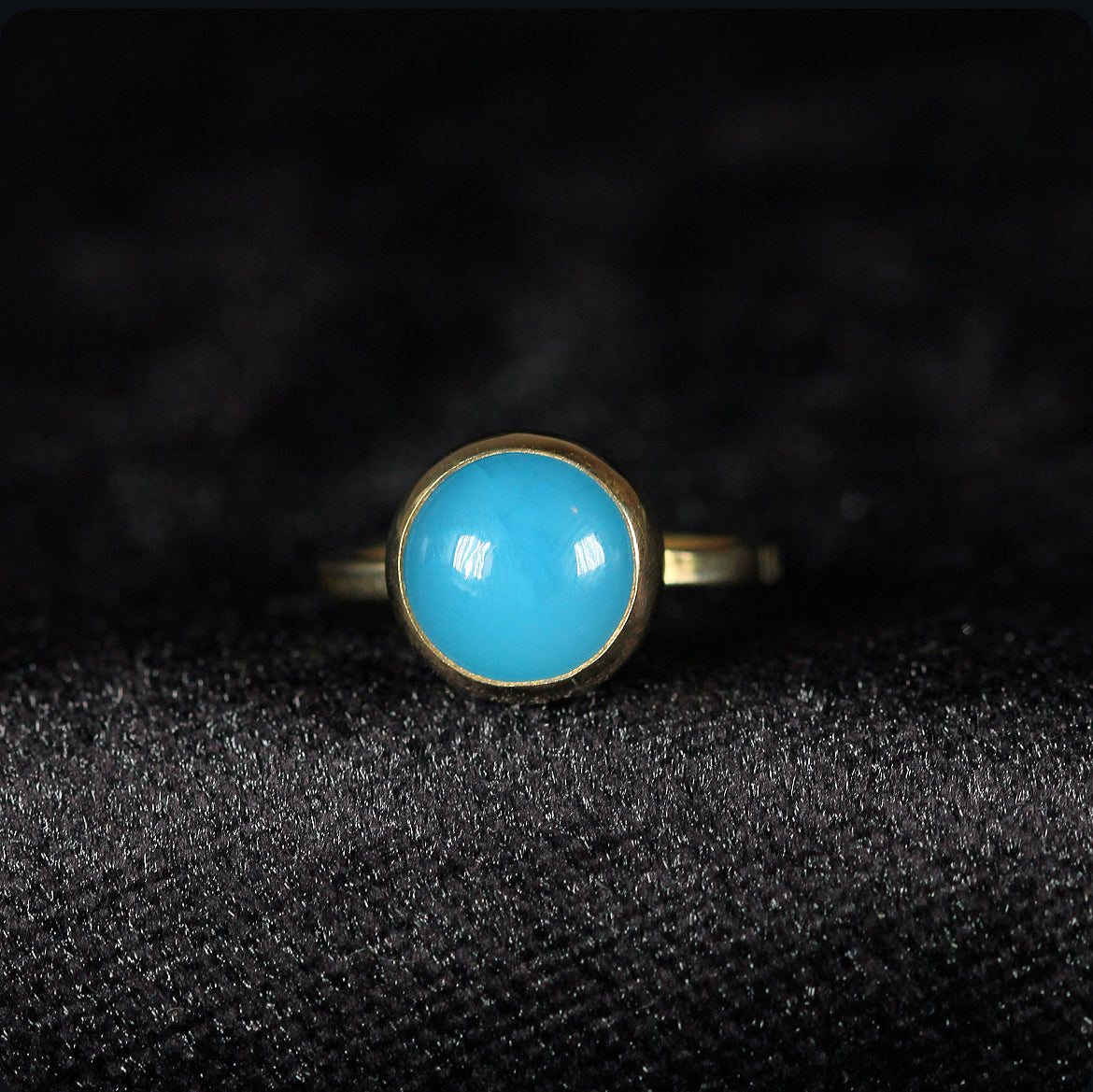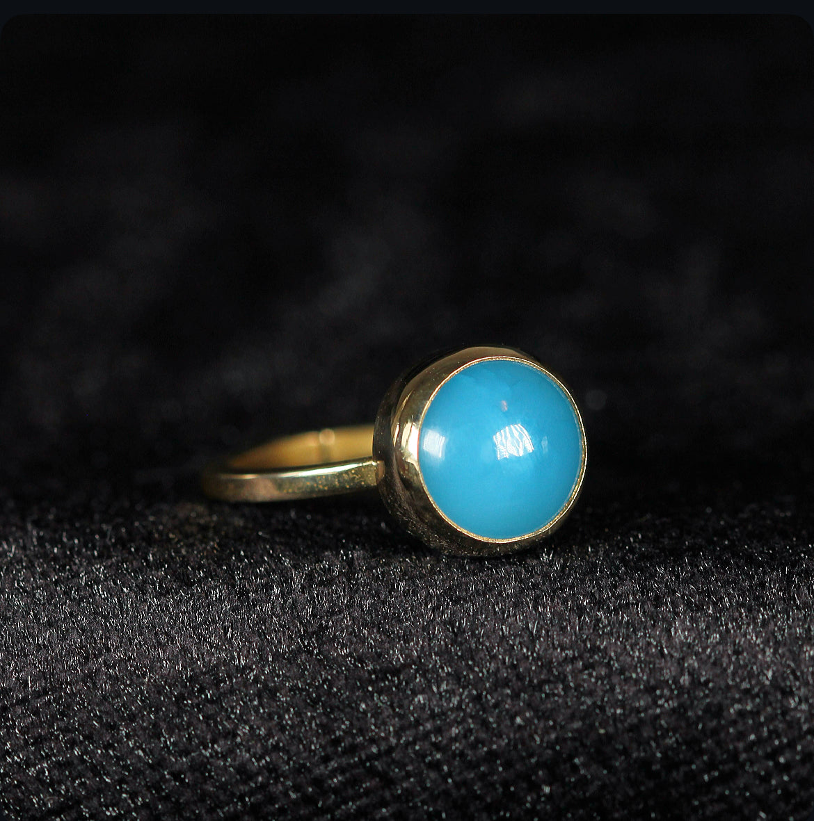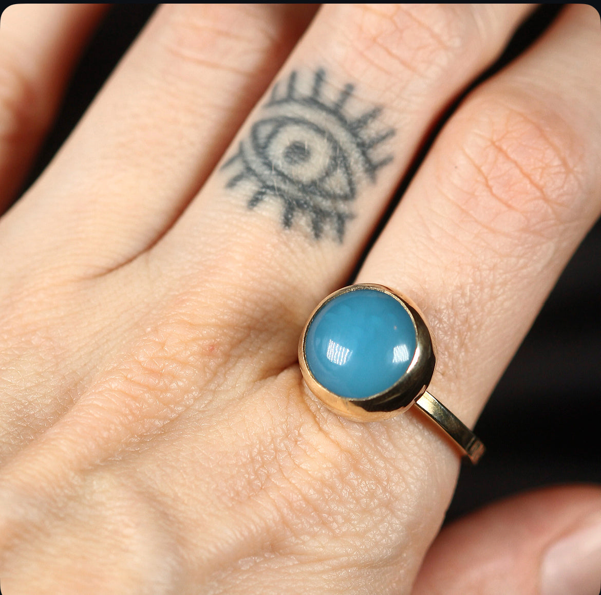 A bold statement in brass and stone. Featuring a polished blue chalcedony cabochon, this adjustable ring embodies raw elegance. The deep azure glow contrasts against its golden bezel, echoing the untamed energy of ocean and sky.