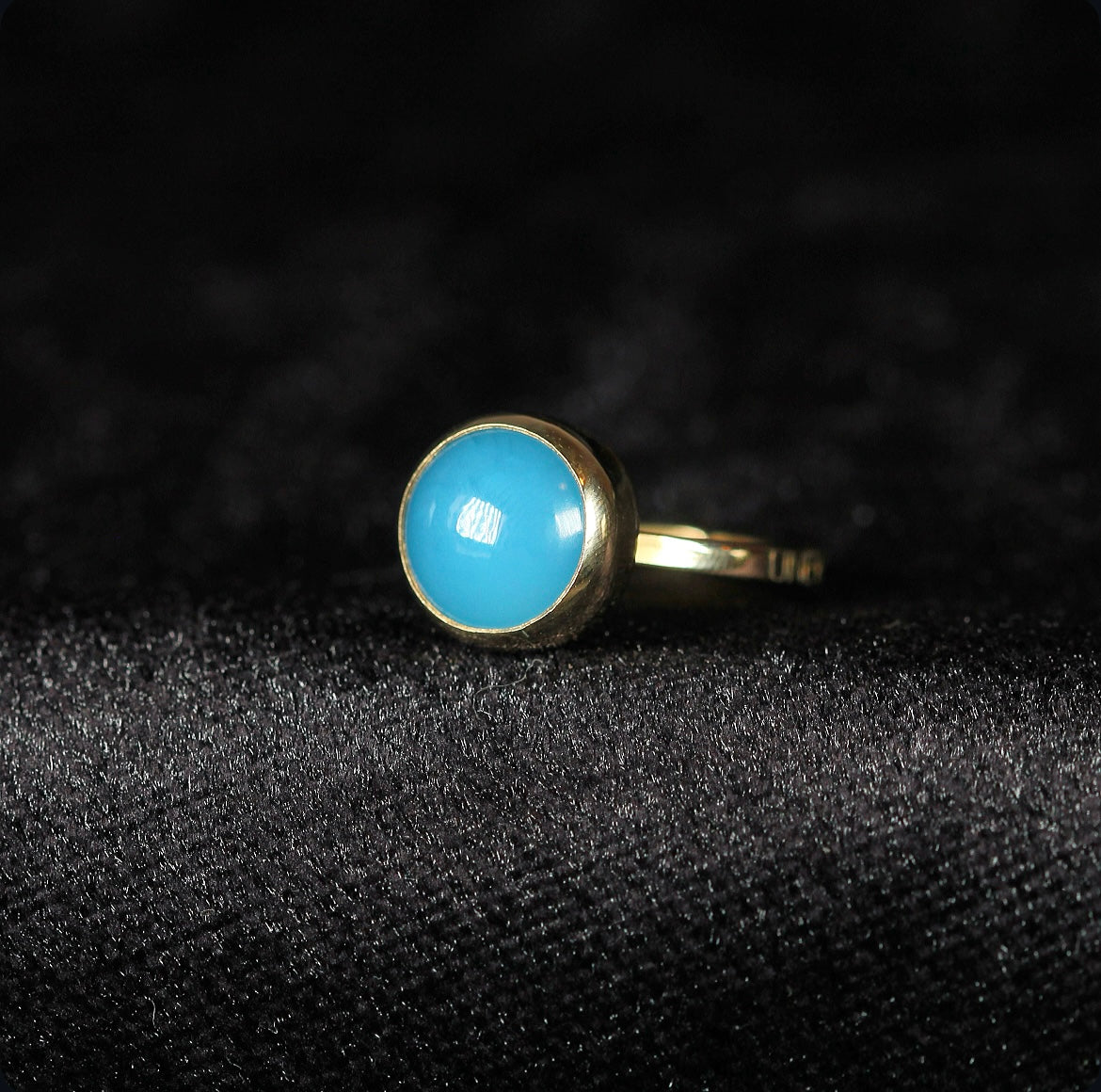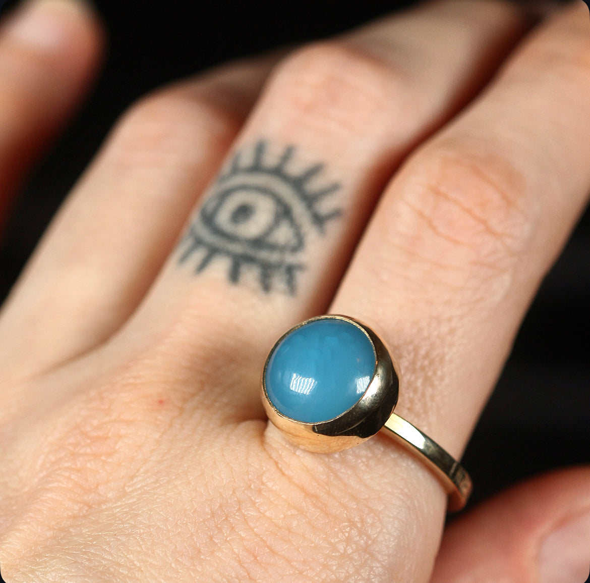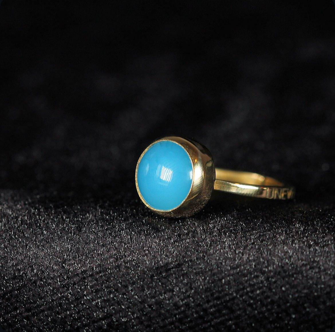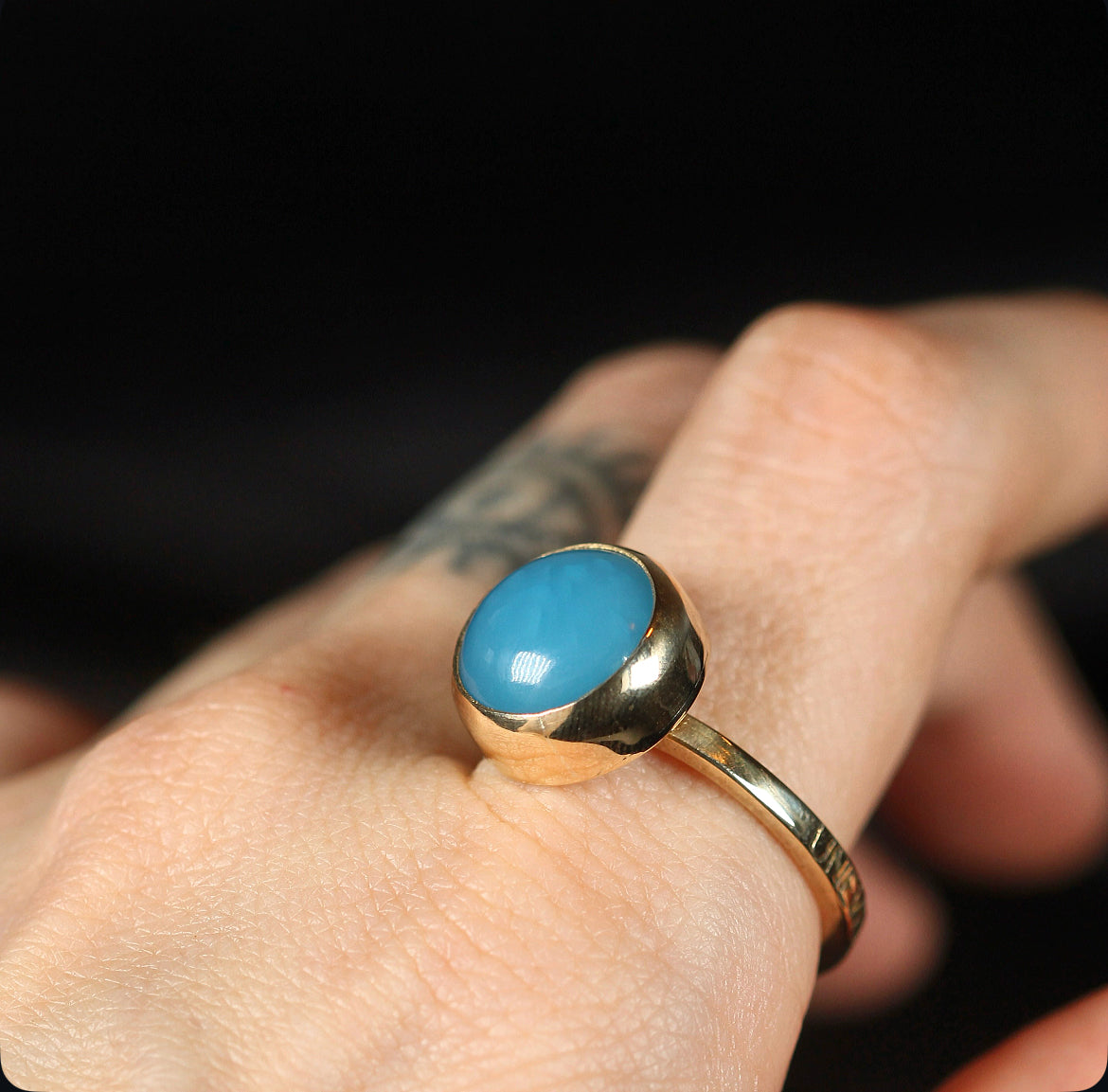 A bold statement in brass and stone. Featuring a polished blue chalcedony cabochon, this adjustable ring embodies raw elegance. The deep azure glow contrasts against its golden bezel, echoing the untamed energy of ocean and sky.