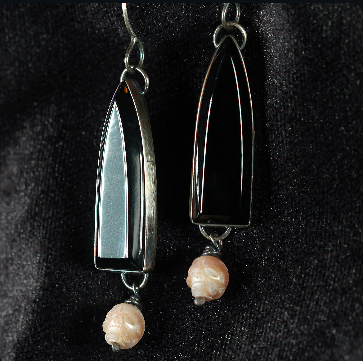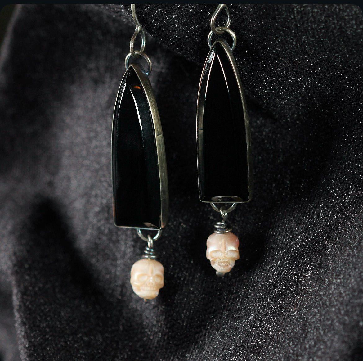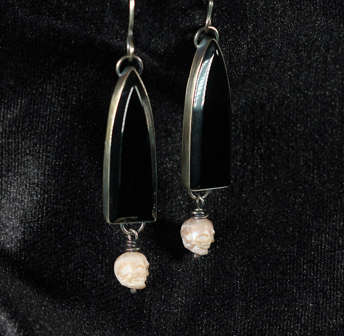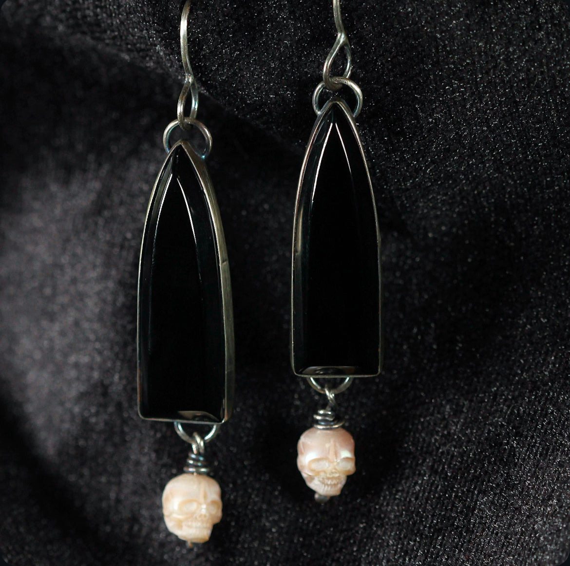 Elongated black onyx mirrors the stillness of night, while carved skull pearls hang below fragile, eternal, divine.