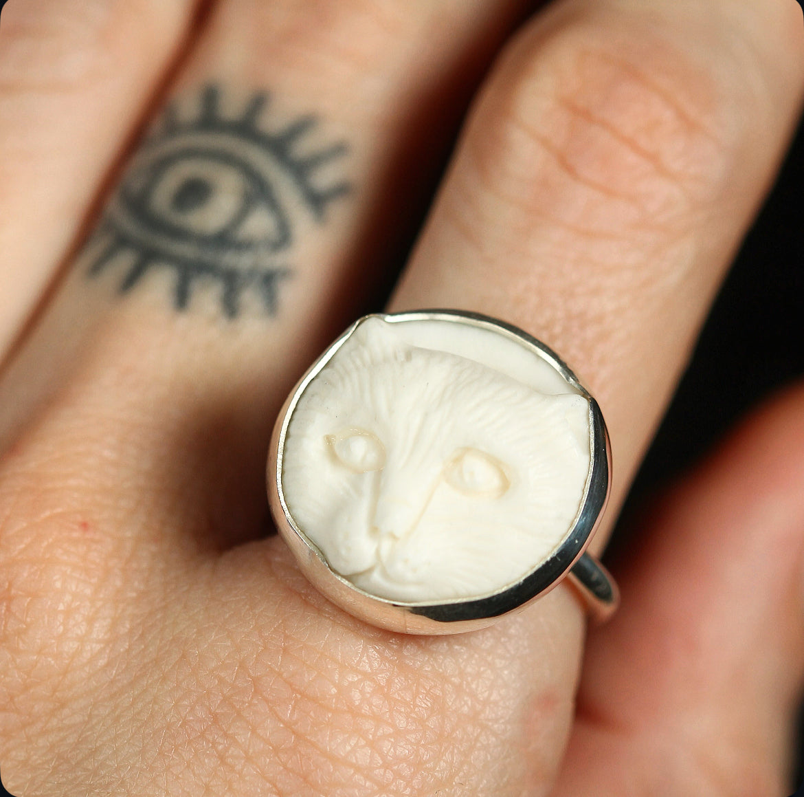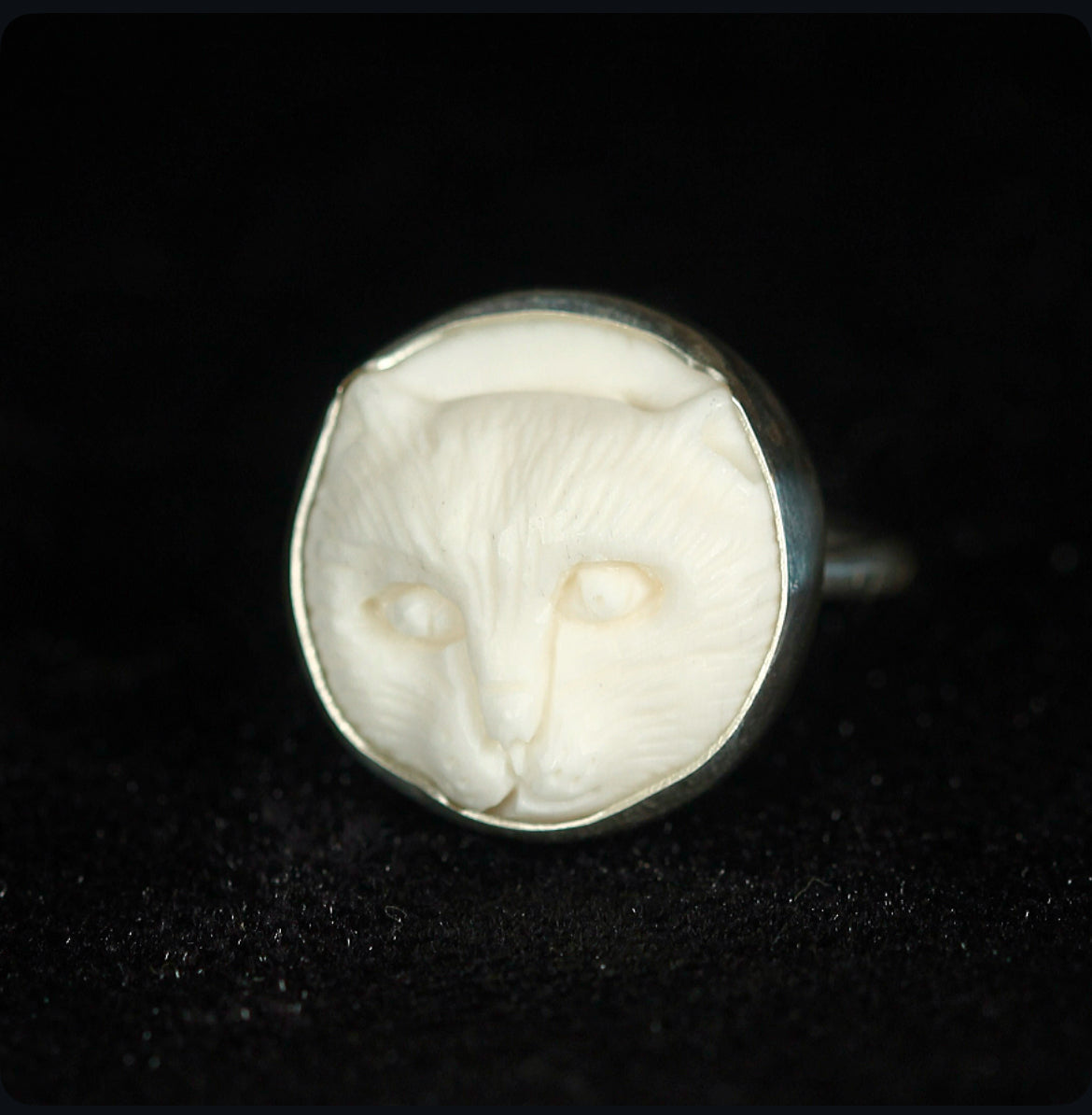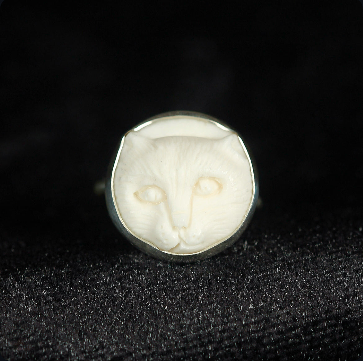 Hand carved from natural bone, this adjustable ring captures the essence of the feline spirit enigmatic, watchful, and timeless. Set in 925 sterling silver, the detailed cat face reflects both mystery and guardianship, making it more than a ring: it’s a talisman.