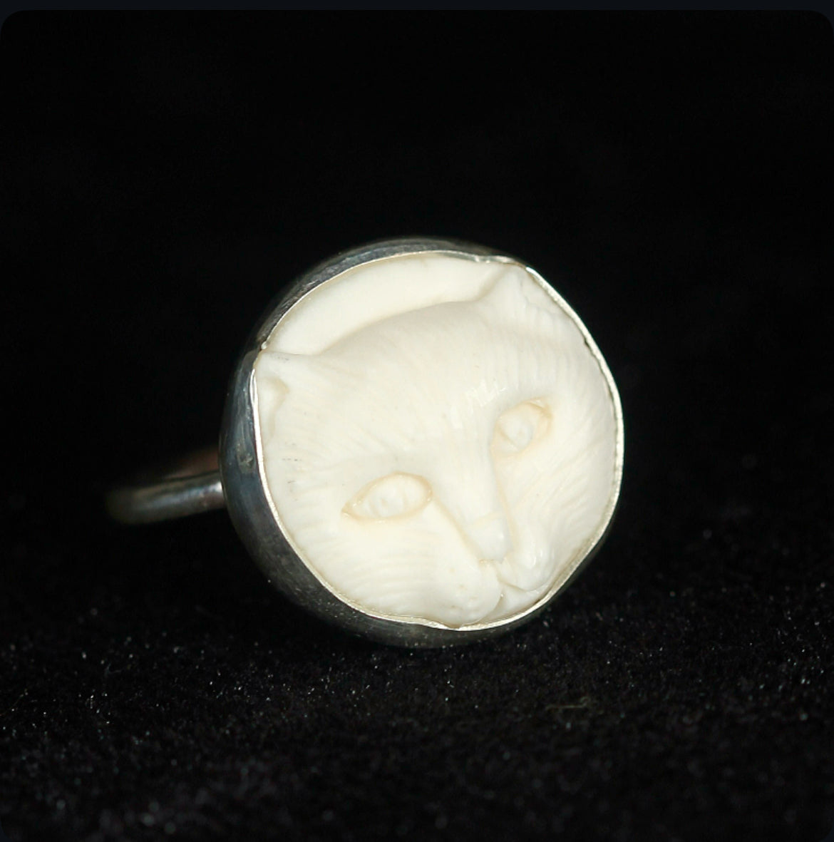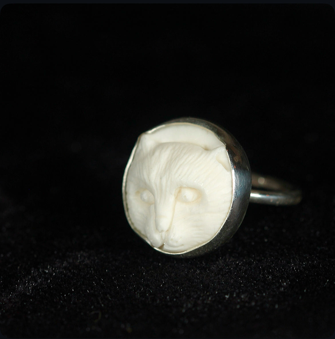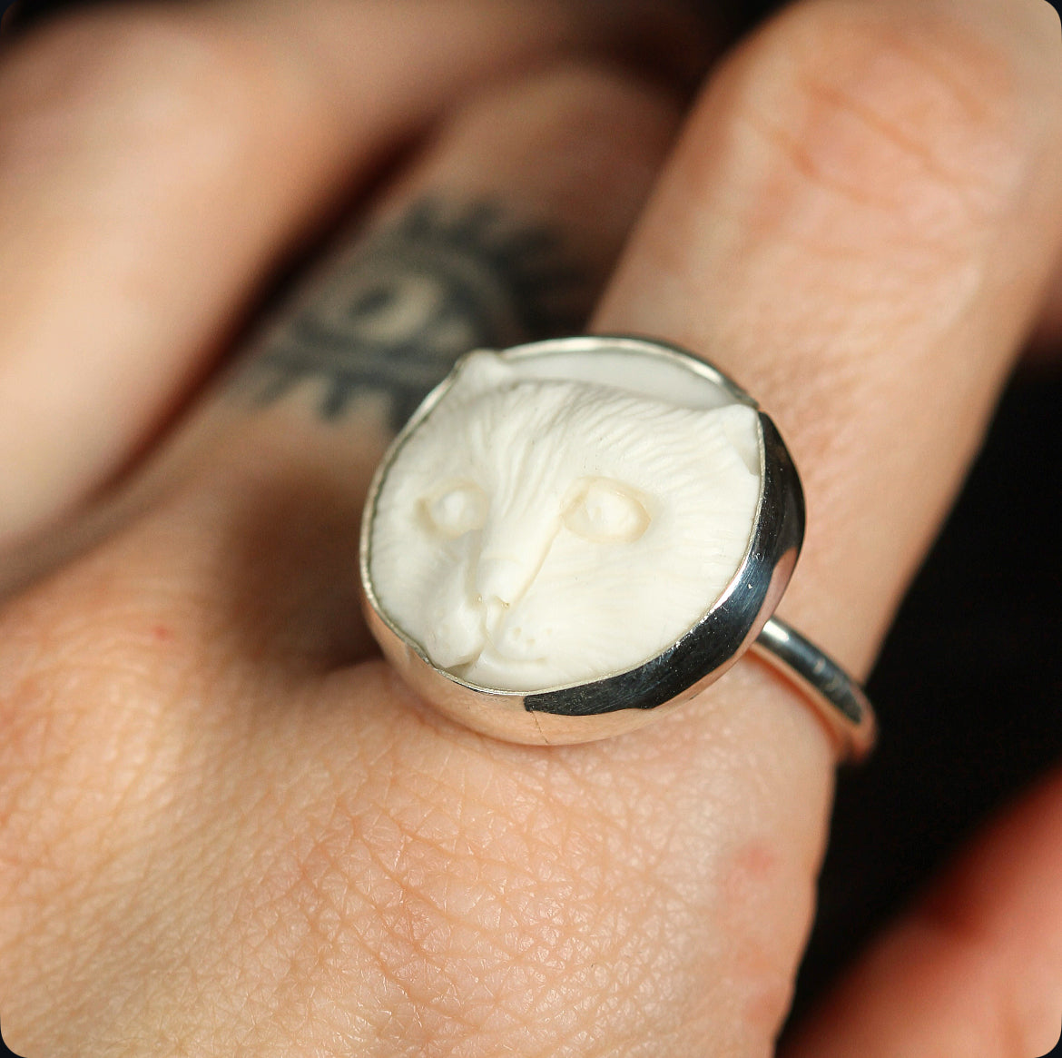 Hand carved from natural bone, this adjustable ring captures the essence of the feline spirit enigmatic, watchful, and timeless. Set in 925 sterling silver, the detailed cat face reflects both mystery and guardianship, making it more than a ring: it’s a talisman.