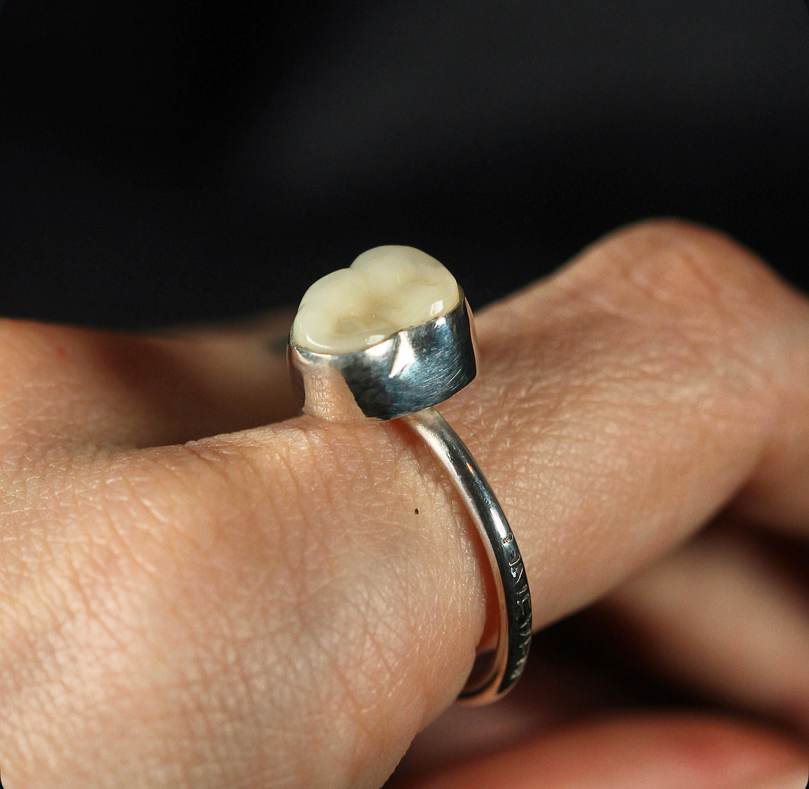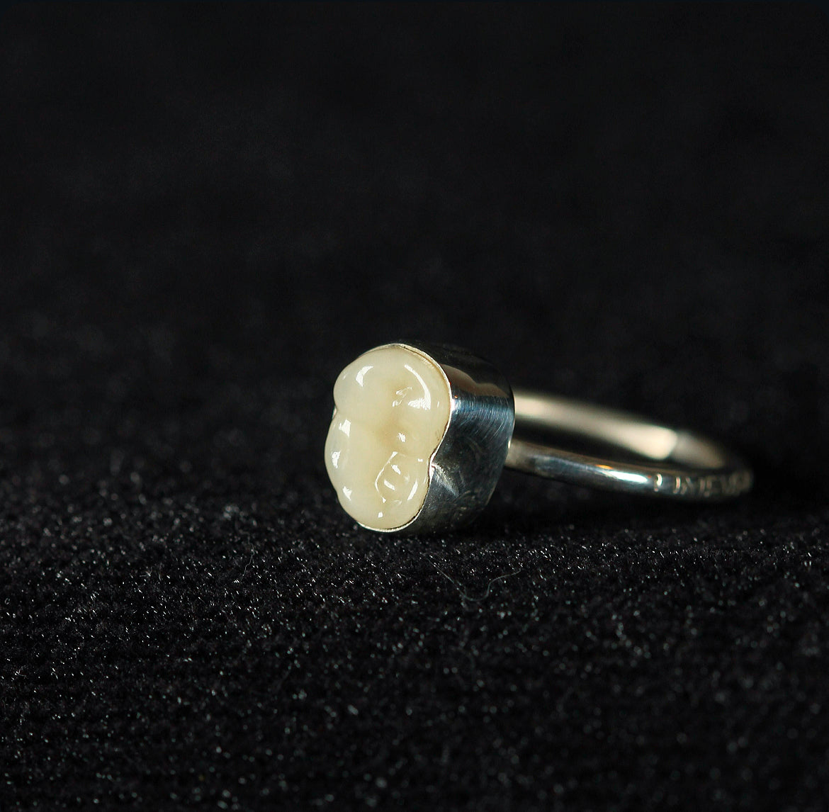 A small tooth, cast in resin and framed in silver a fragment of innocence turned eternal.