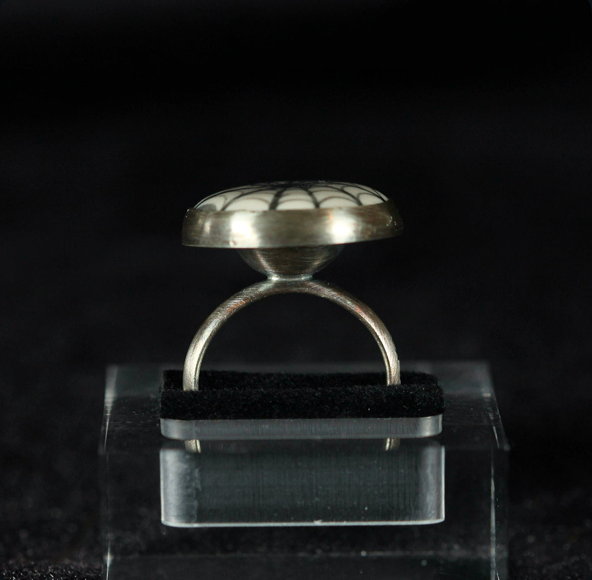 A delicate spider web, hand-painted on porcelain and framed in oxidized silver a quiet trap for beauty itself.