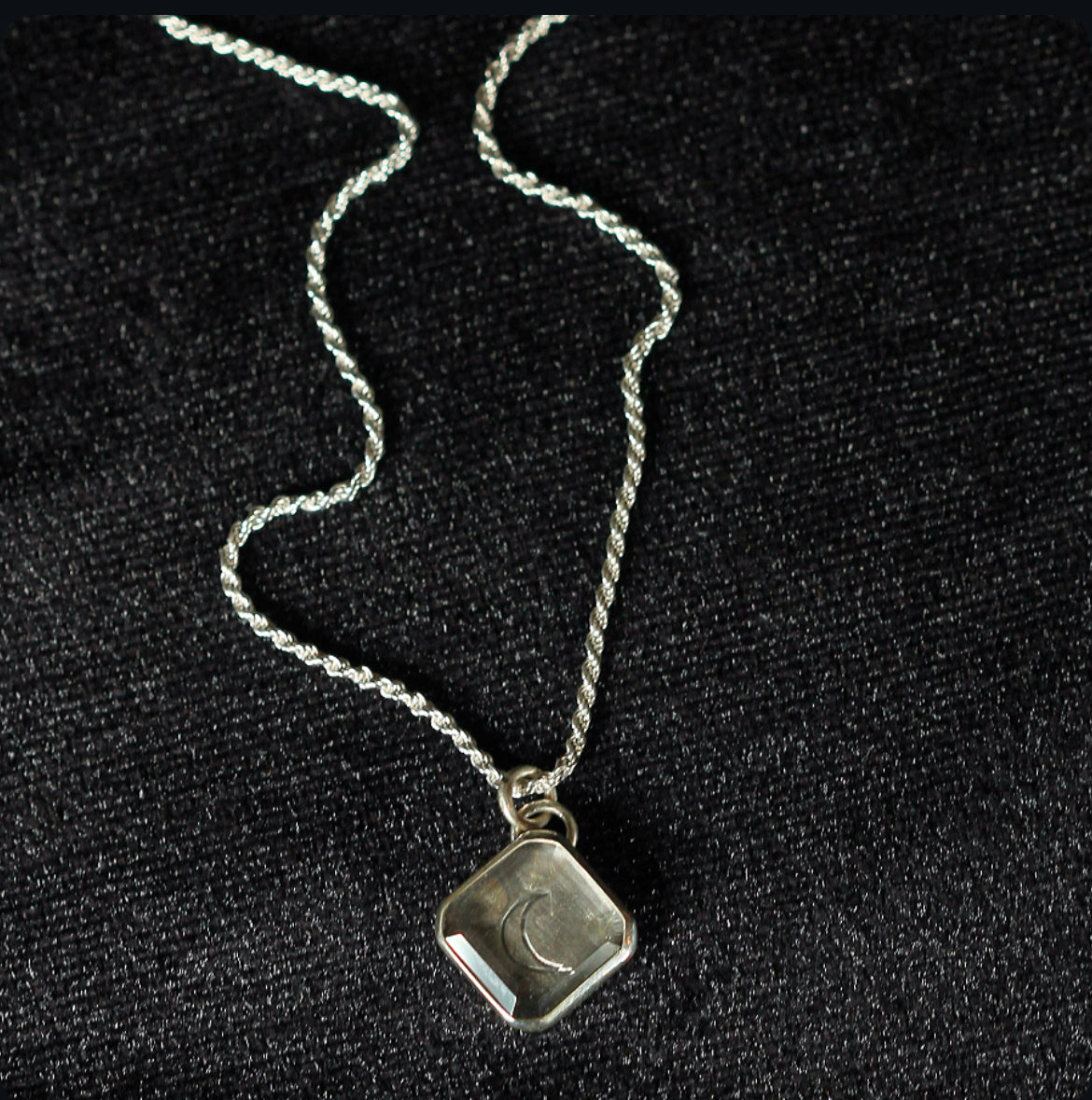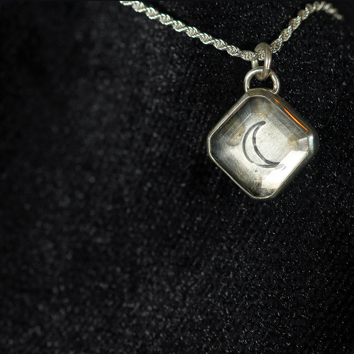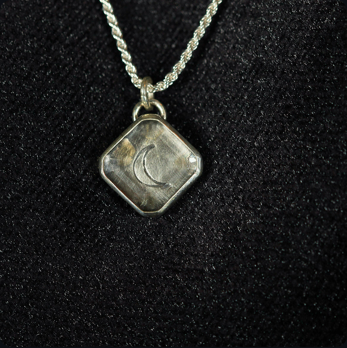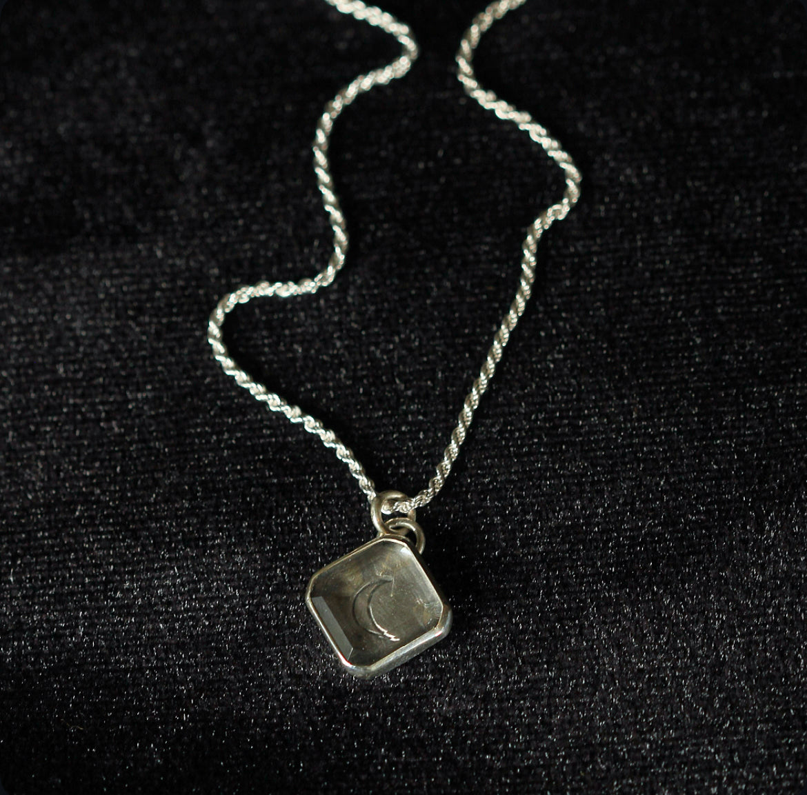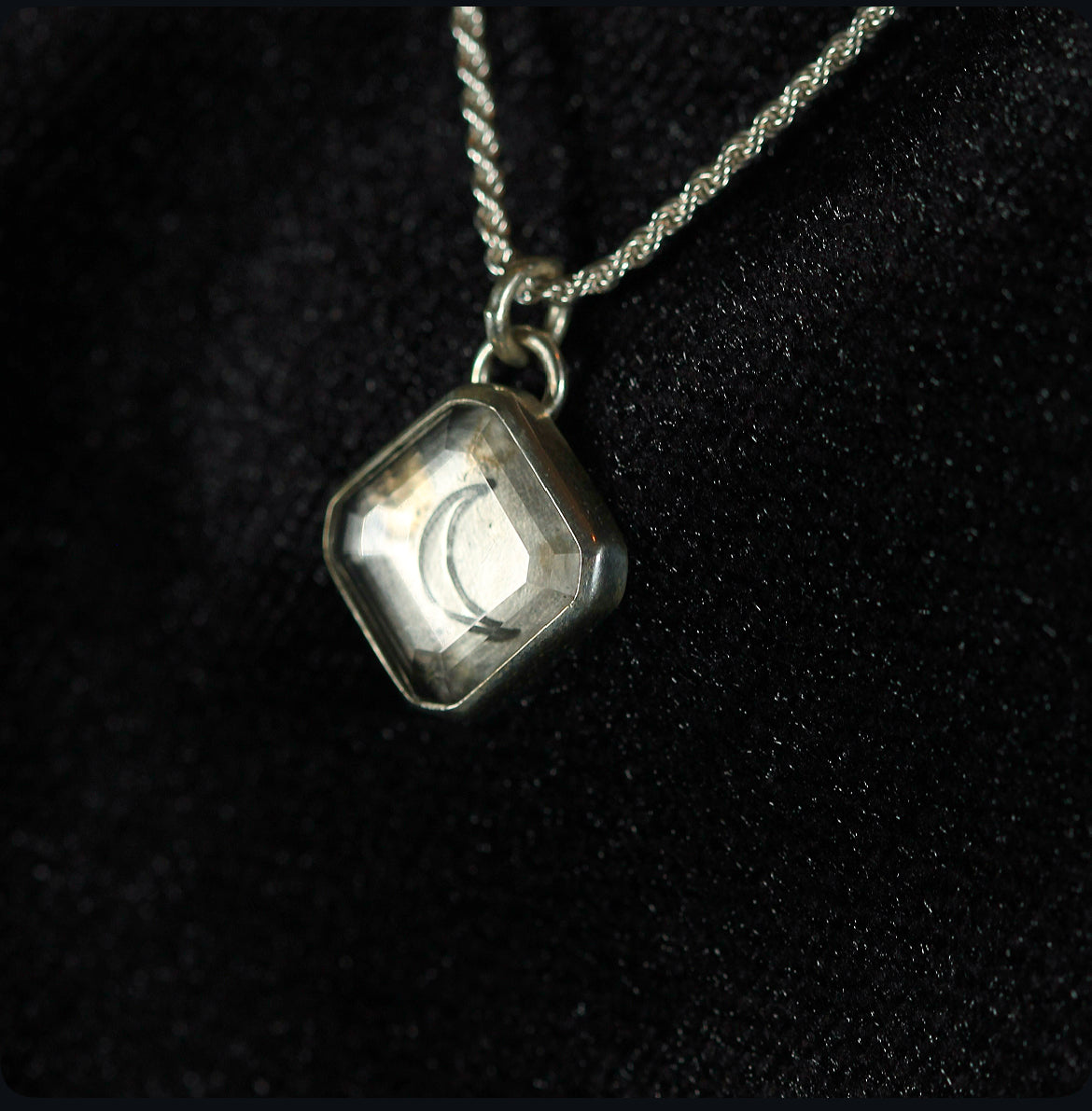 Handcrafted in oxidized 925 sterling silver, this necklace cradles a polished clear quartz, guarding the image of a crescent moon etched within. Suspended from an 18” French rope chain (1.8 mm thick), it embodies the quiet power and mystique of lunar light.
