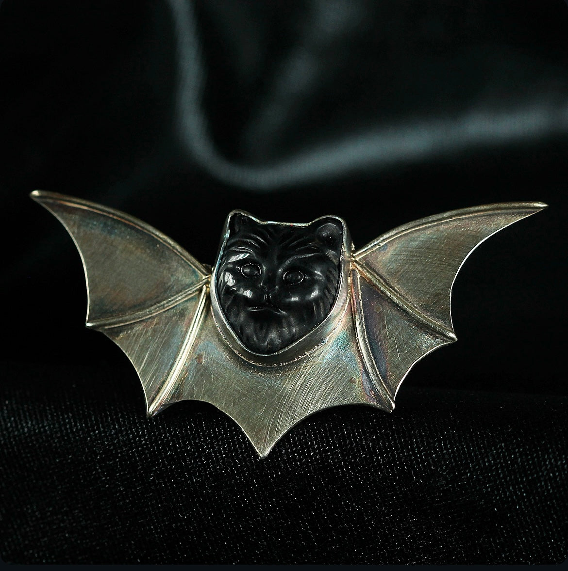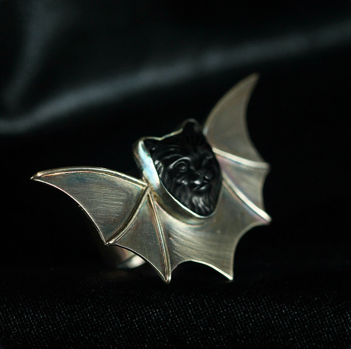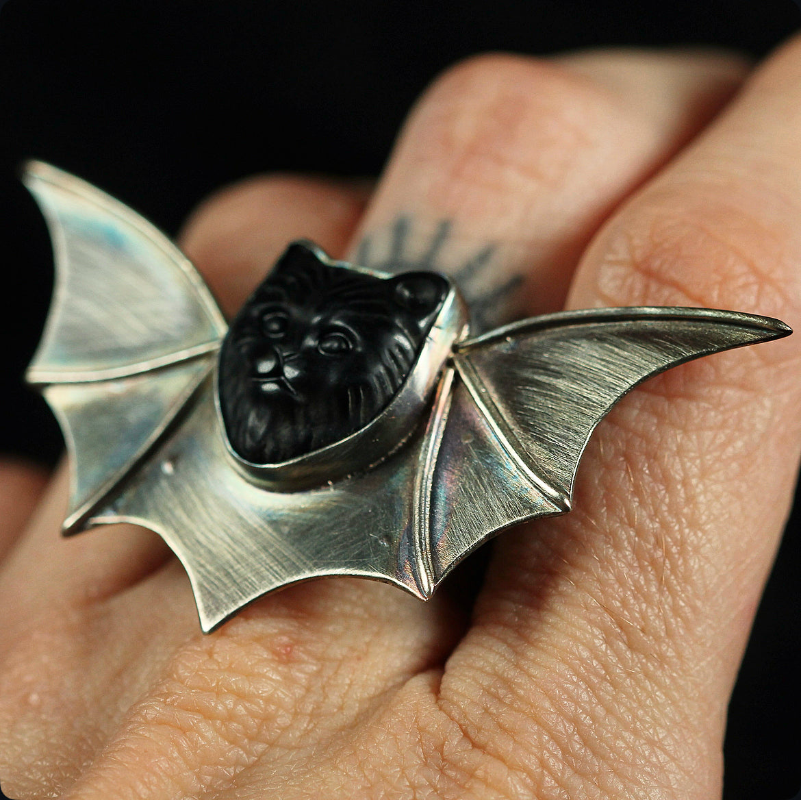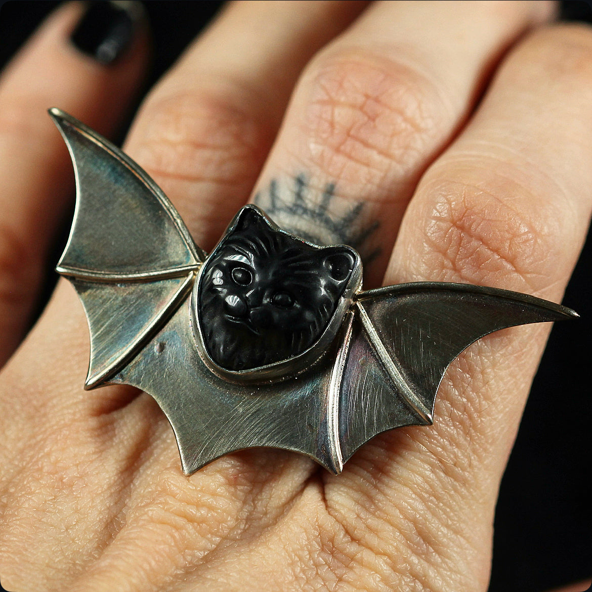 Unleash your inner darkness with our GOTH CAT ring. Crafted from 925 silver, this ring features a striking black obsidian cat face and intricately detailed bat wing. The rainbow tone oxidized finish adds a touch of mystique.