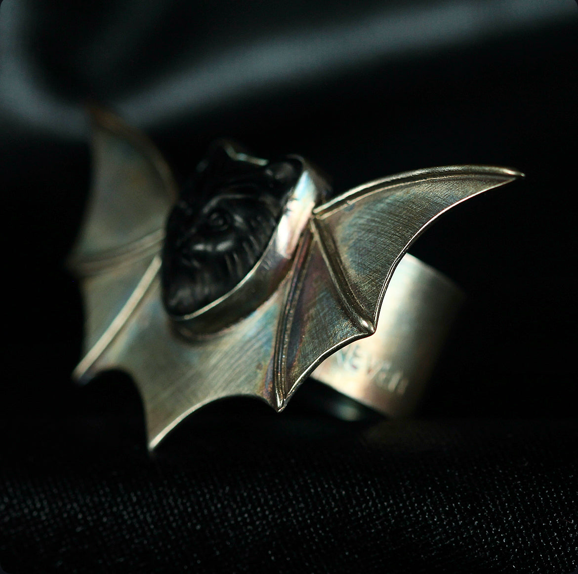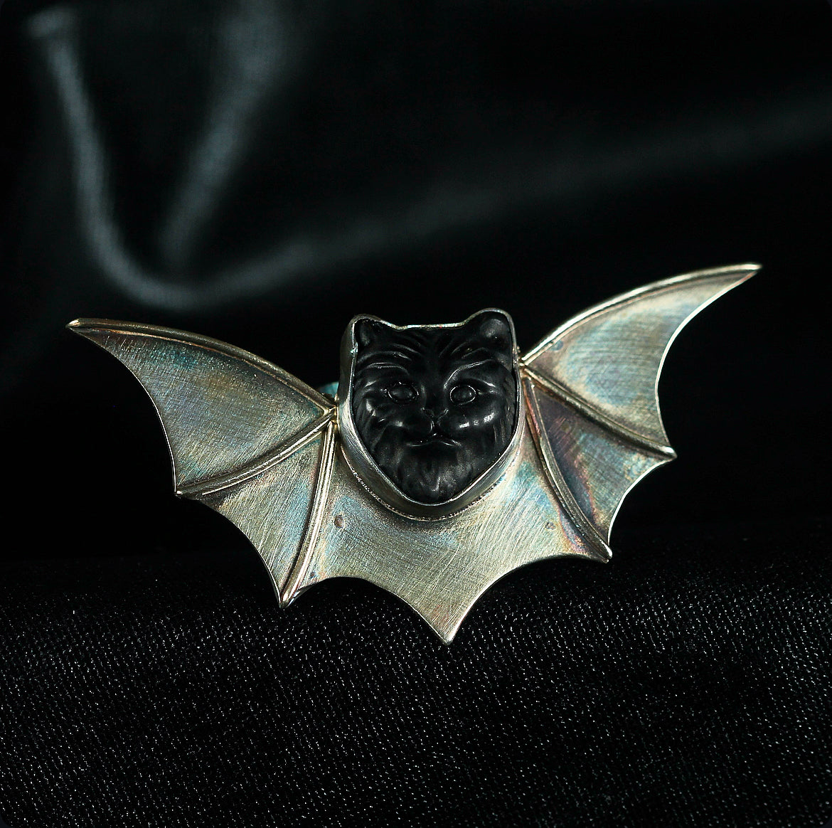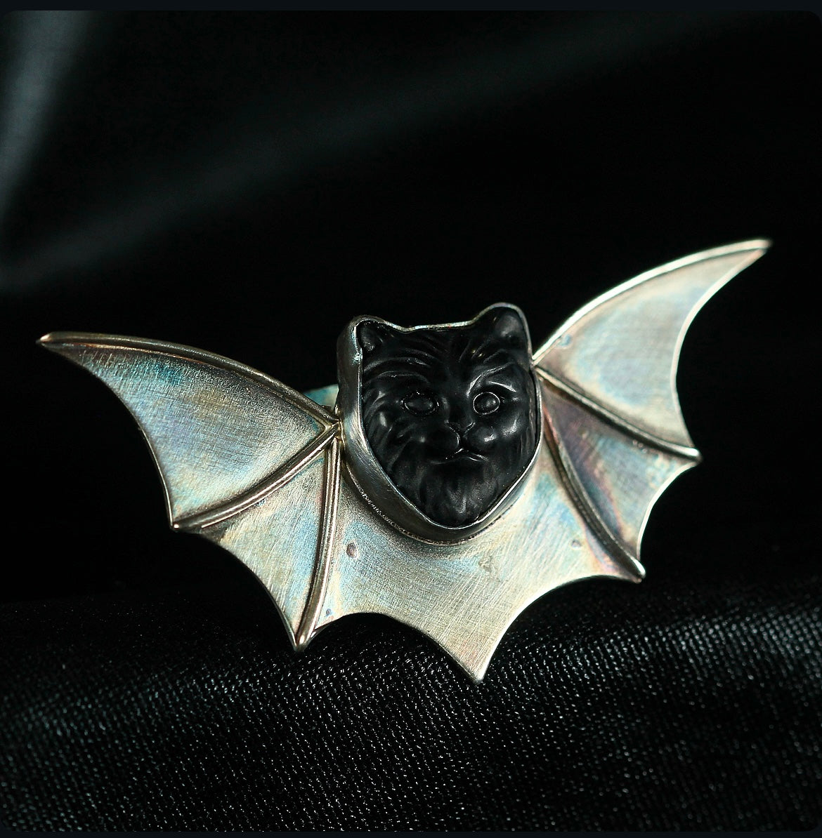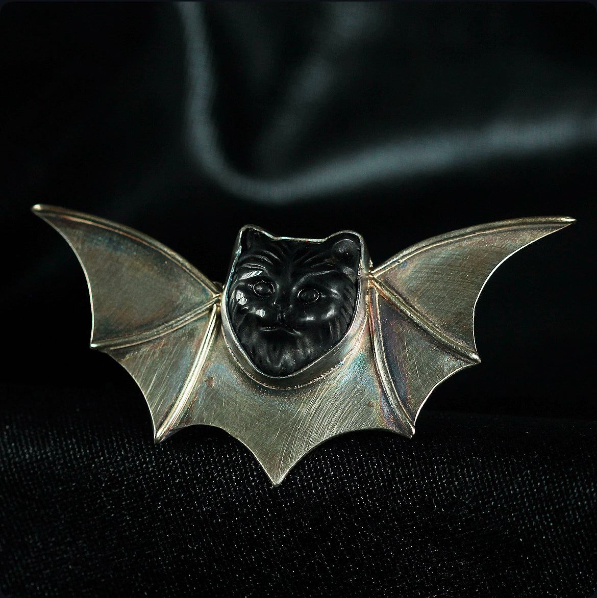 Unleash your inner darkness with our GOTH CAT ring. Crafted from 925 silver, this ring features a striking black obsidian cat face and intricately detailed bat wing. The rainbow tone oxidized finish adds a touch of mystique.