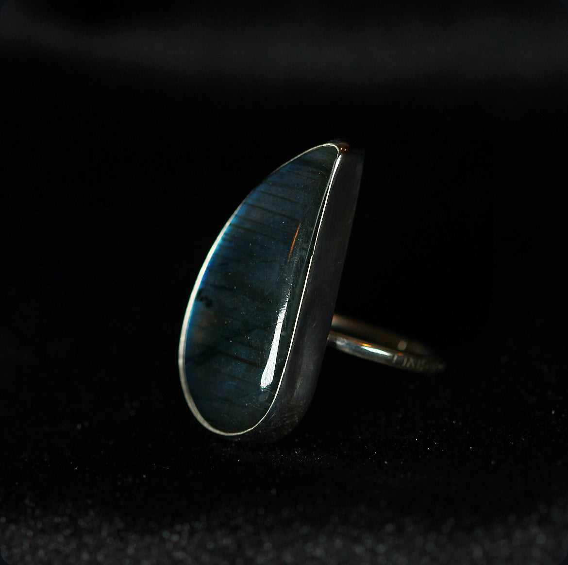 Handcrafted in 925 sterling silver, this ring is set with an authentic Blue Flash Labradorite. Its band is fully adjustable, designed to adapt without losing strength or elegance.