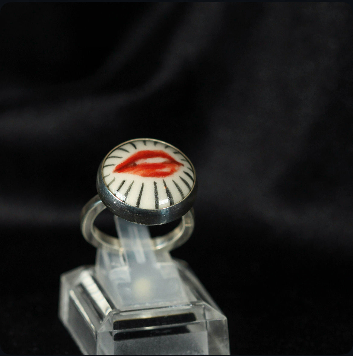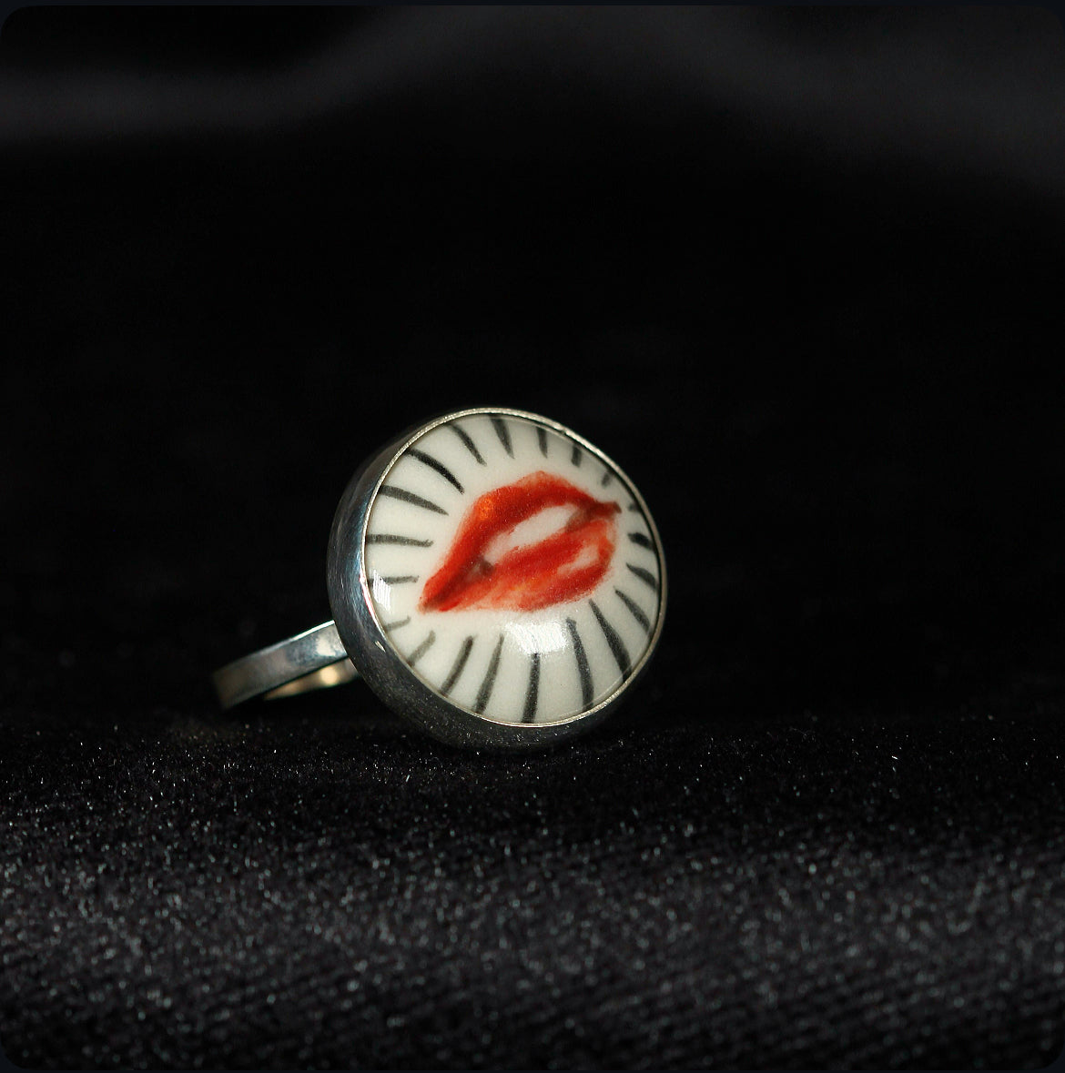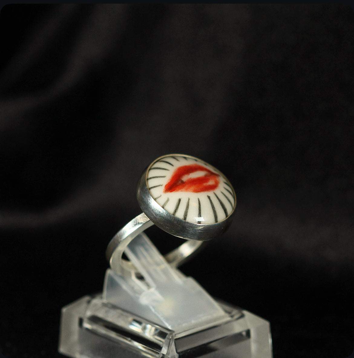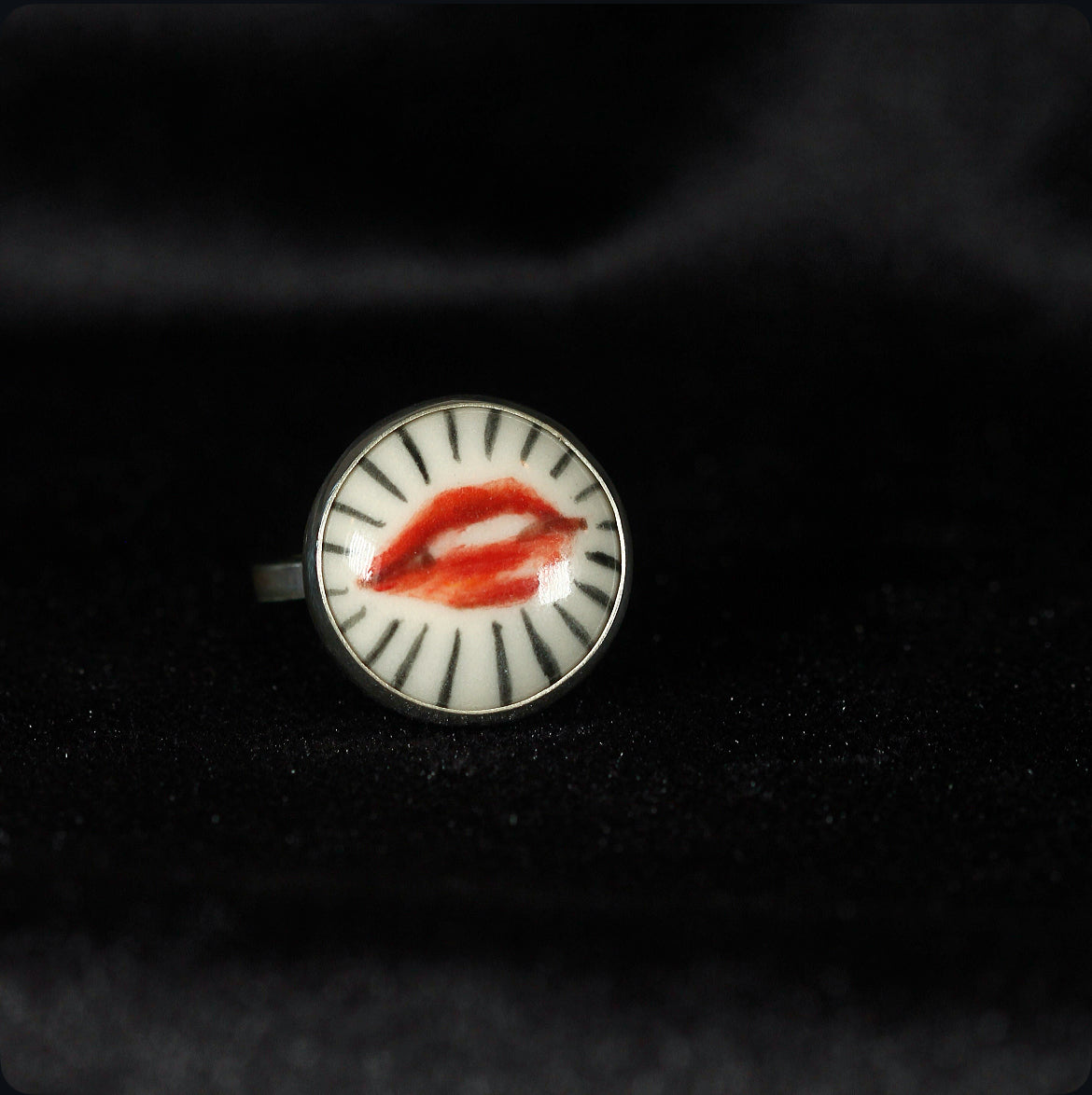 Crafted in 925 sterling silver and crowned with a delicate disc of porcelain, this adjustable ring holds a miniature work of art lips meticulously hand painted, each brushstroke carrying its own expression and soul. The union of noble metal with the delicate beauty of porcelain creates a magnetic contrast, transforming the piece into a wearable talisman. This ring is one of a kind, bearing the mark of its artisan painting and the allure of the unrepeatable.