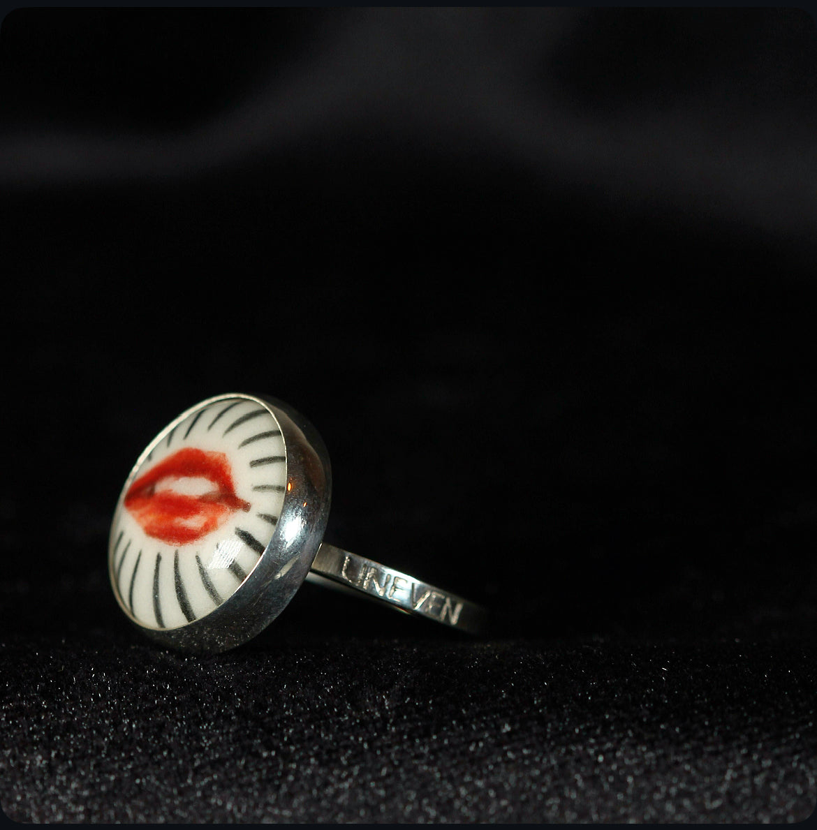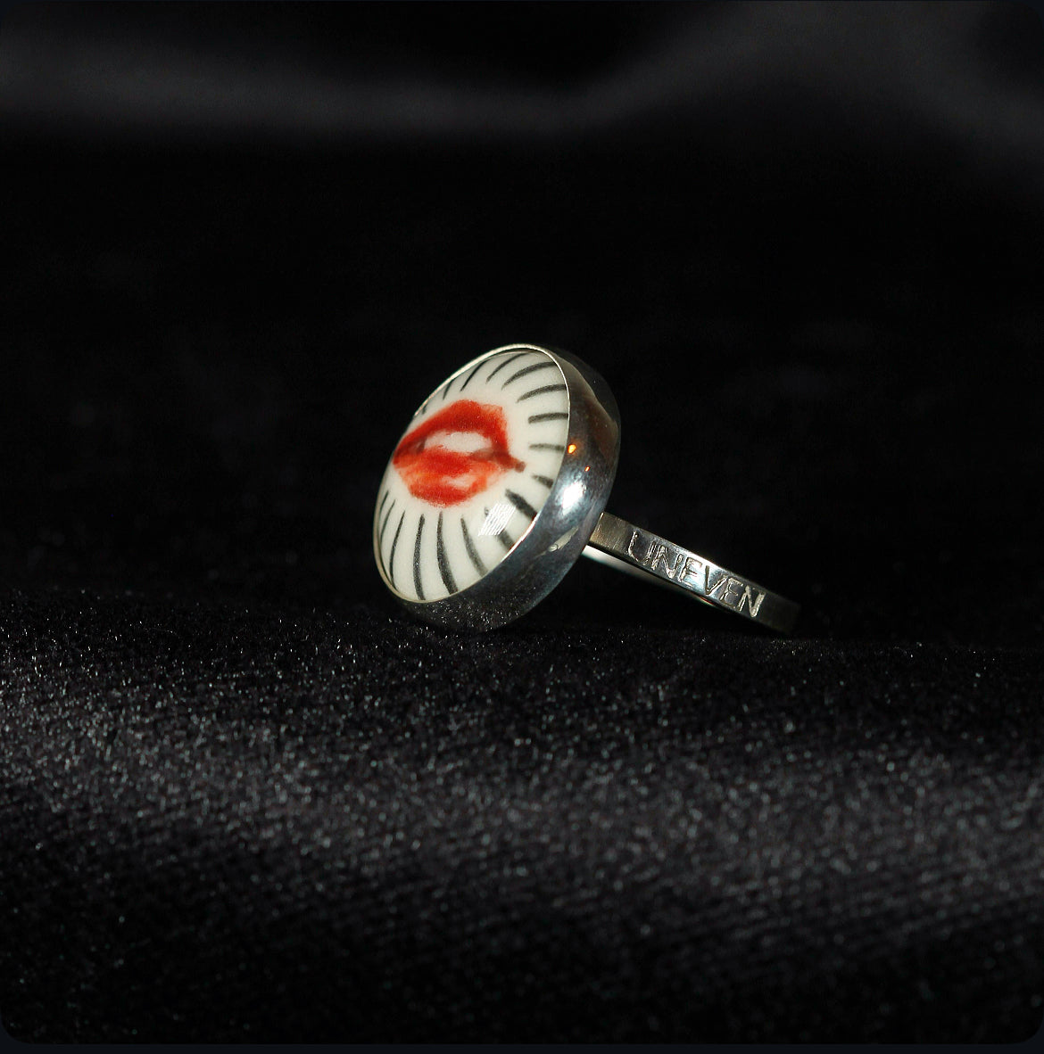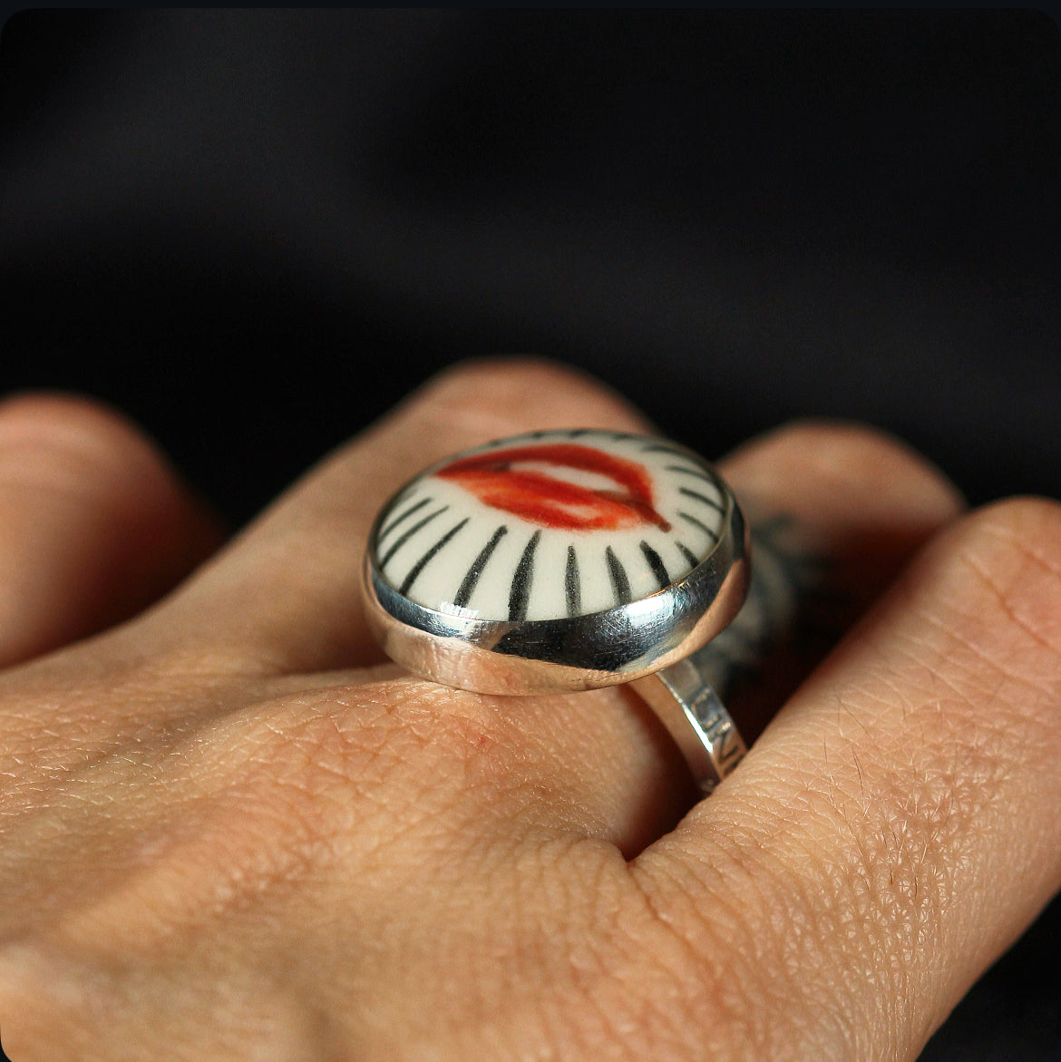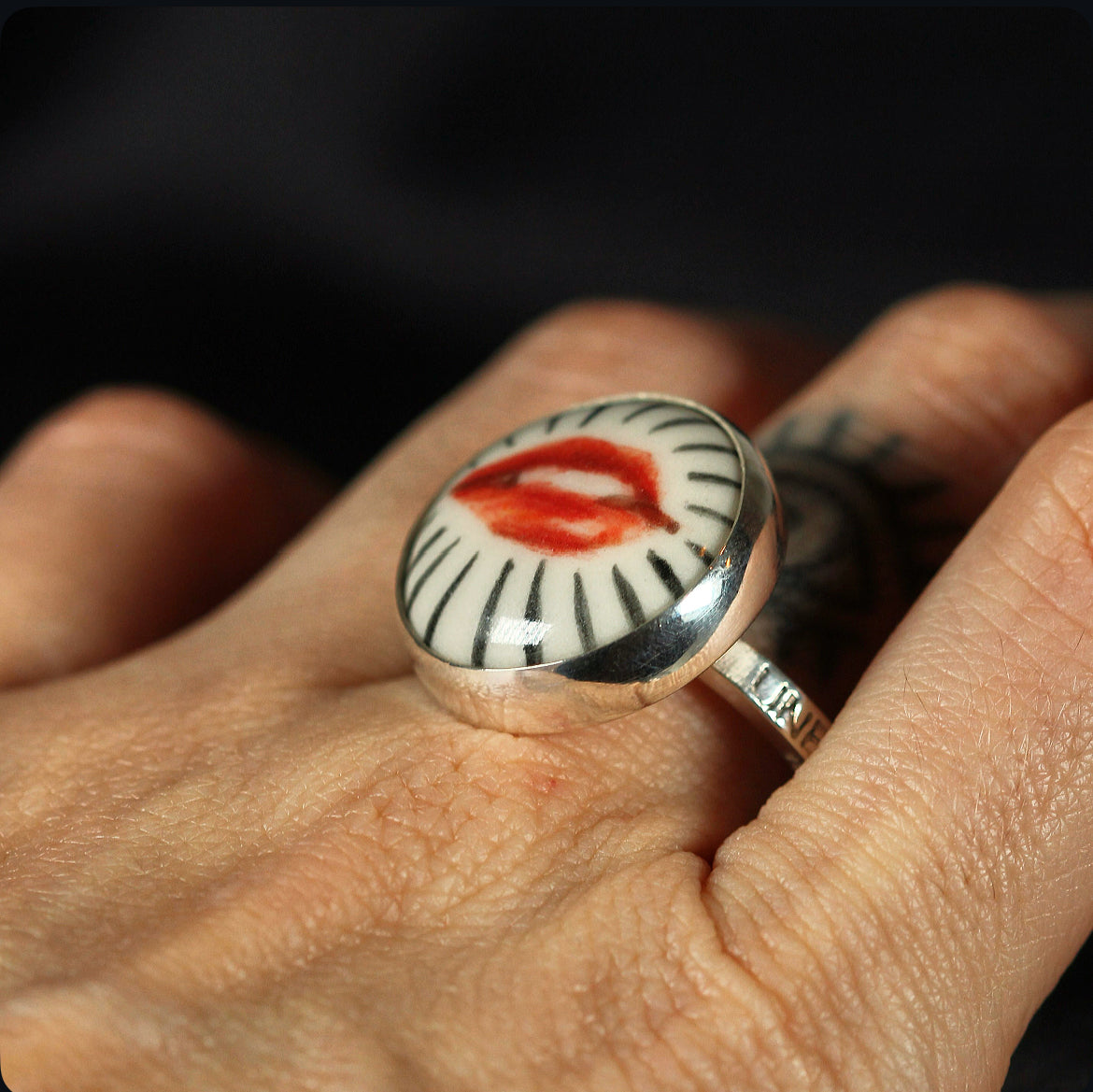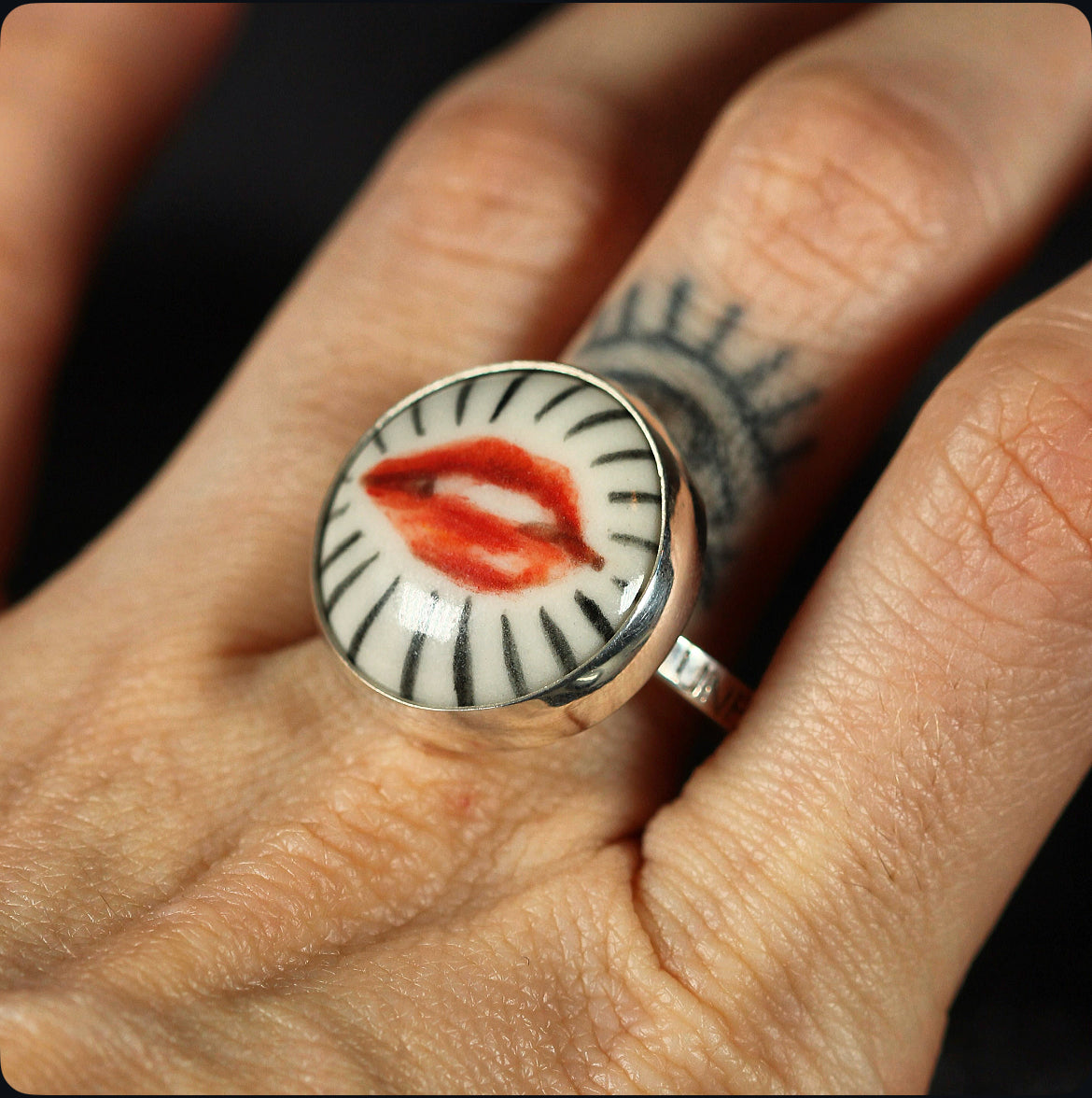 Crafted in 925 sterling silver and crowned with a delicate disc of porcelain, this adjustable ring holds a miniature work of art lips meticulously hand painted, each brushstroke carrying its own expression and soul. The union of noble metal with the delicate beauty of porcelain creates a magnetic contrast, transforming the piece into a wearable talisman. This ring is one of a kind, bearing the mark of its artisan painting and the allure of the unrepeatable.