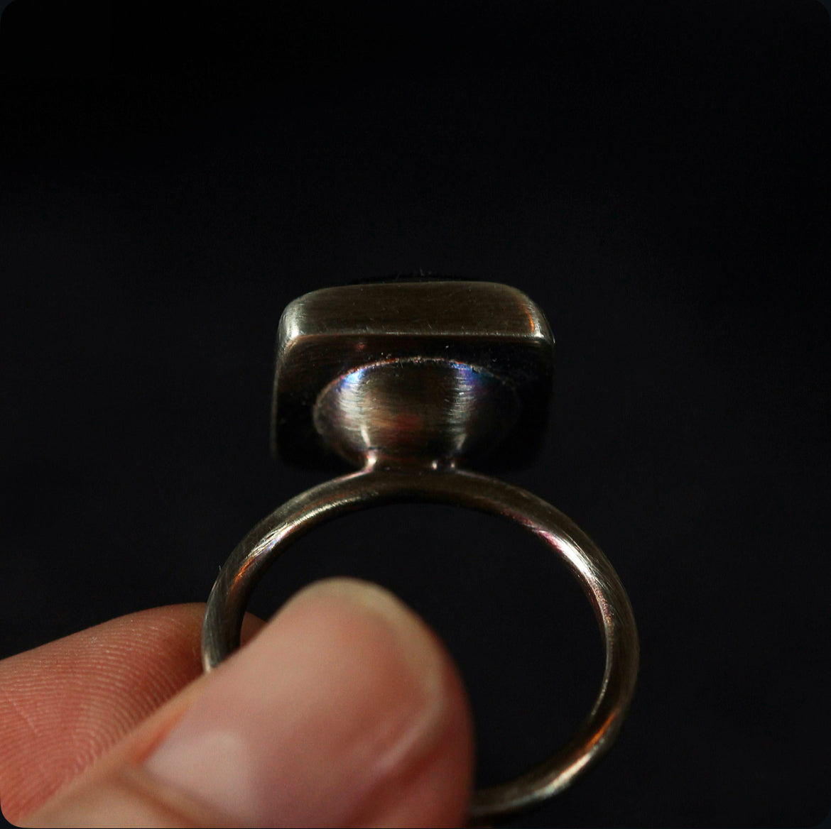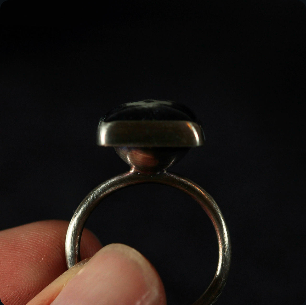 Materials: 925 oxidized sterling silver, hand-painted porcelain skull, domed back