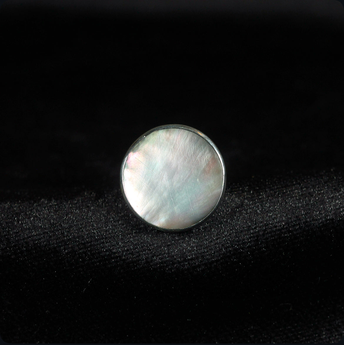 A luminous round Mother of Pearl set in sterling silver, capturing shifting iridescent tones of light and shadow. Bold yet refined, this one of a kind statement ring evokes both softness and strength, designed to stand out with timeless elegance.
