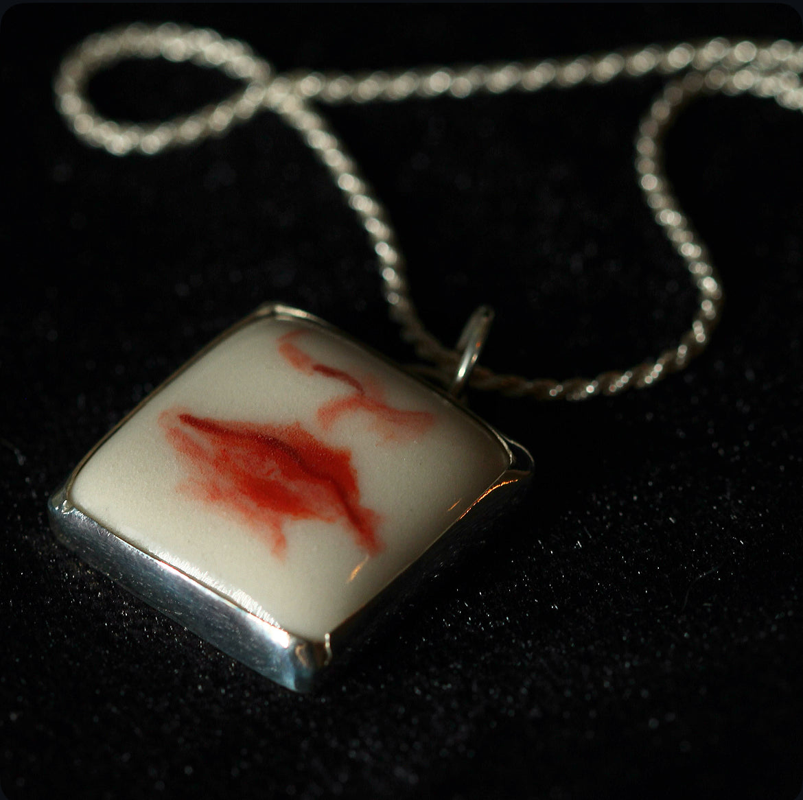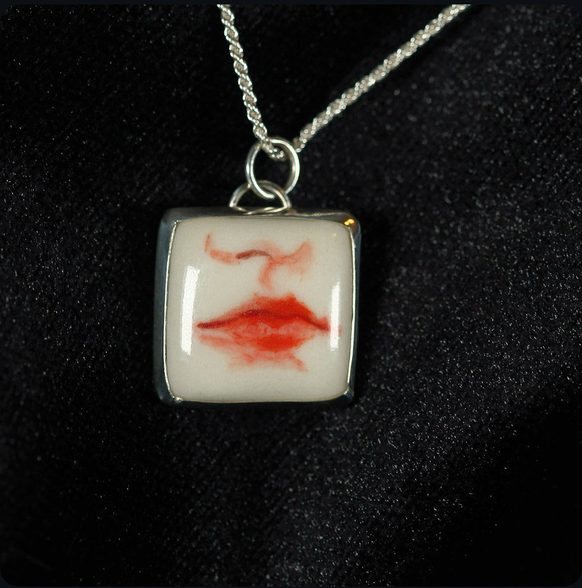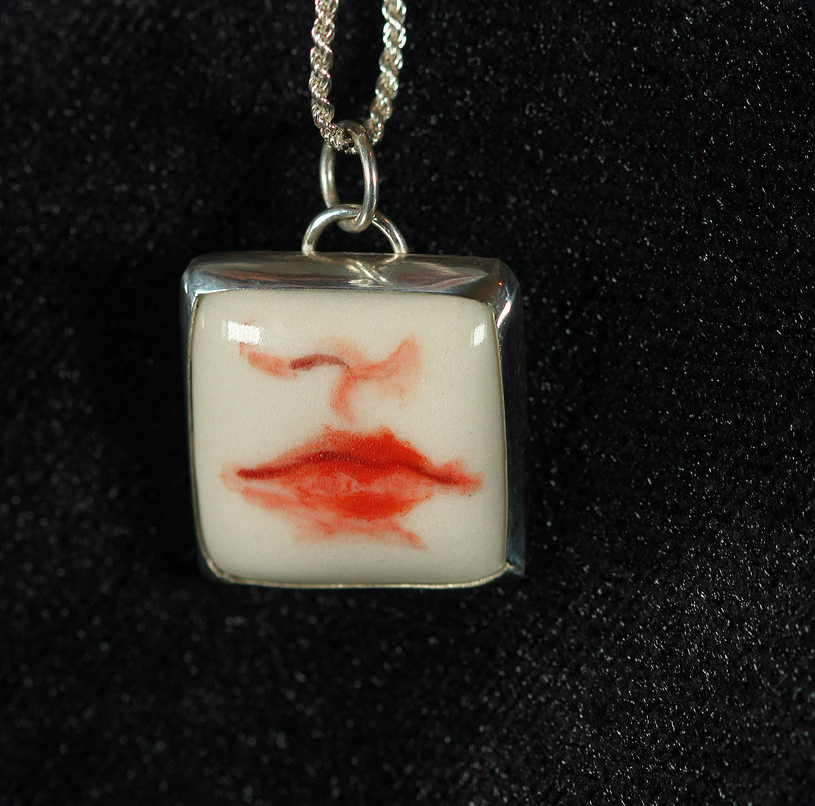 925 sterling silver necklace featuring a hand painted porcelain pendant that embodies both delicacy and timeless allure. The vivid red lips illustration adds a bold and feminine touch, while the 18” French rope chain with a 1.8 mm thickness offers elegance and durability. A one of a kind accessory blending craftsmanship with artistic expression.