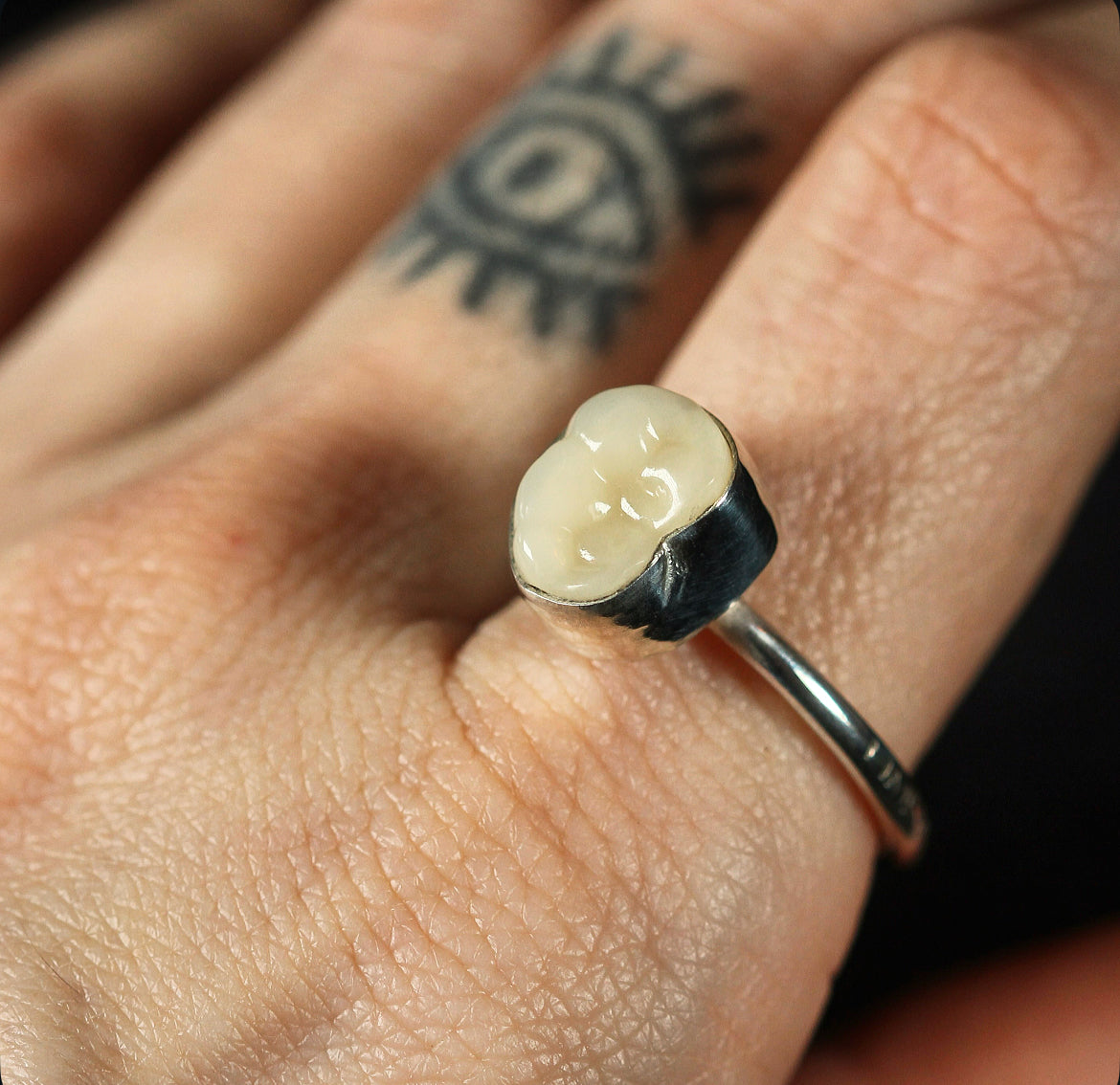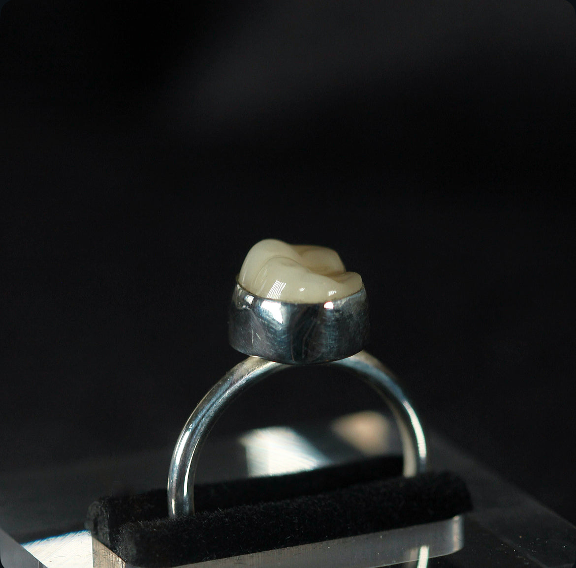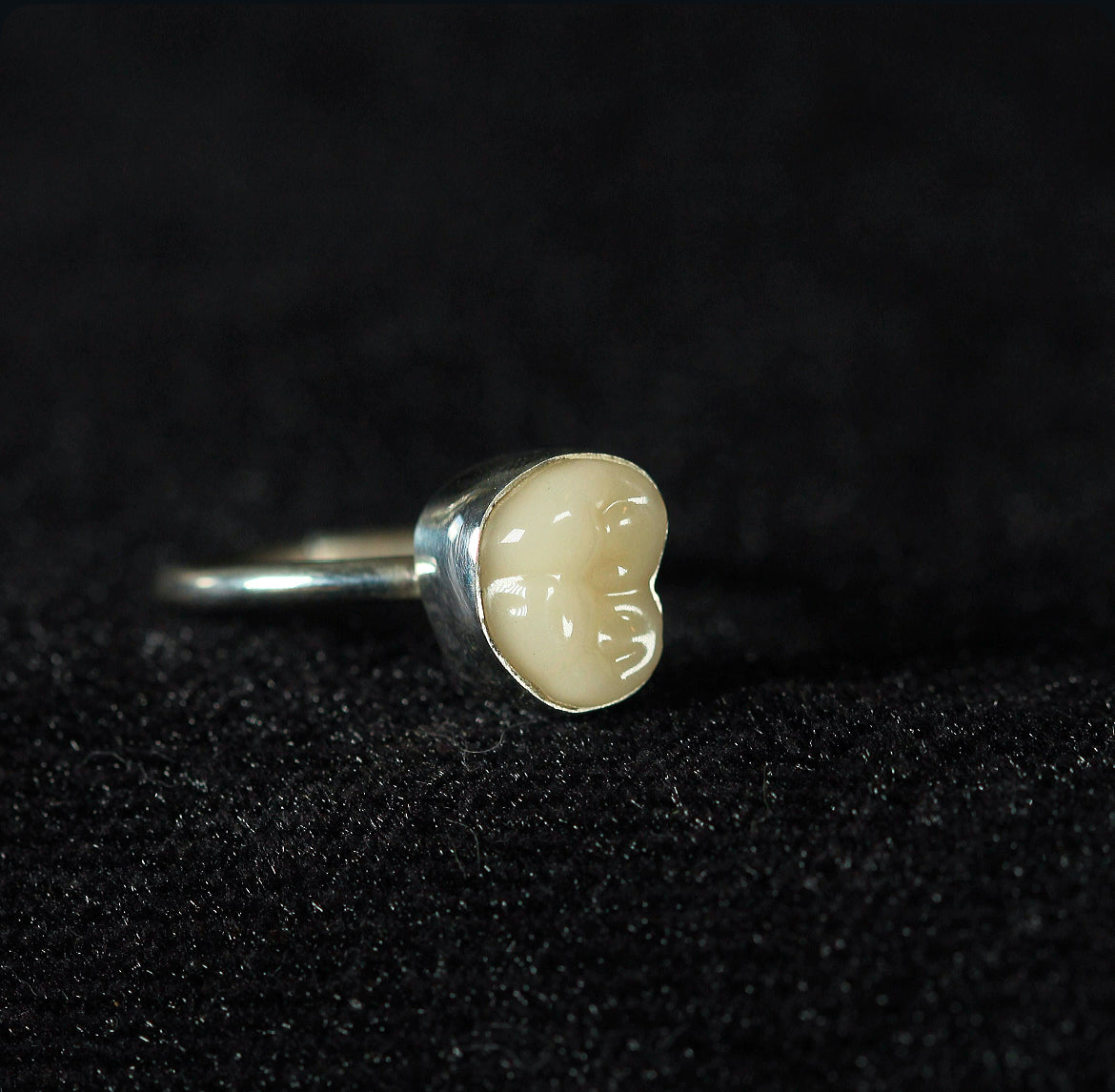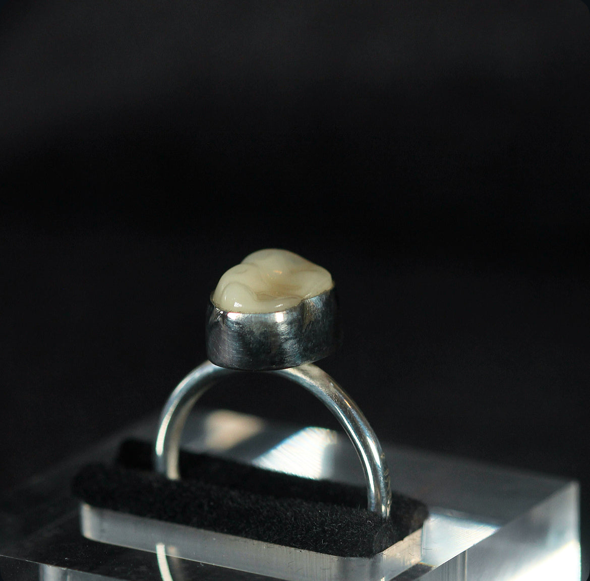 A small tooth, cast in resin and framed in silver a fragment of innocence turned eternal.