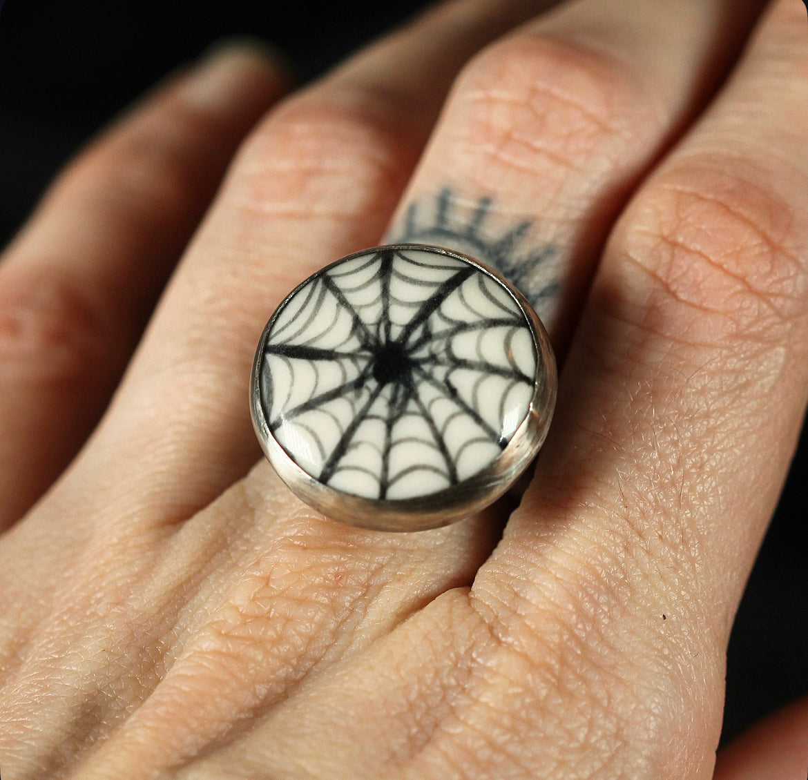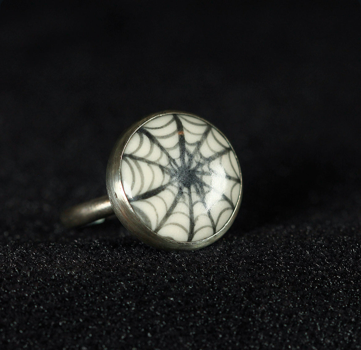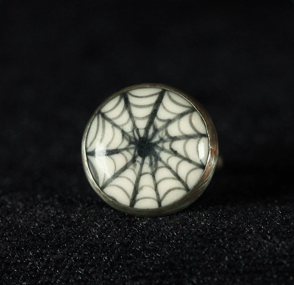 A delicate spider web, hand-painted on porcelain and framed in oxidized silver a quiet trap for beauty itself.