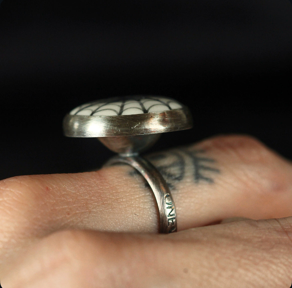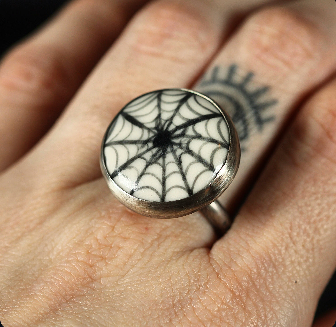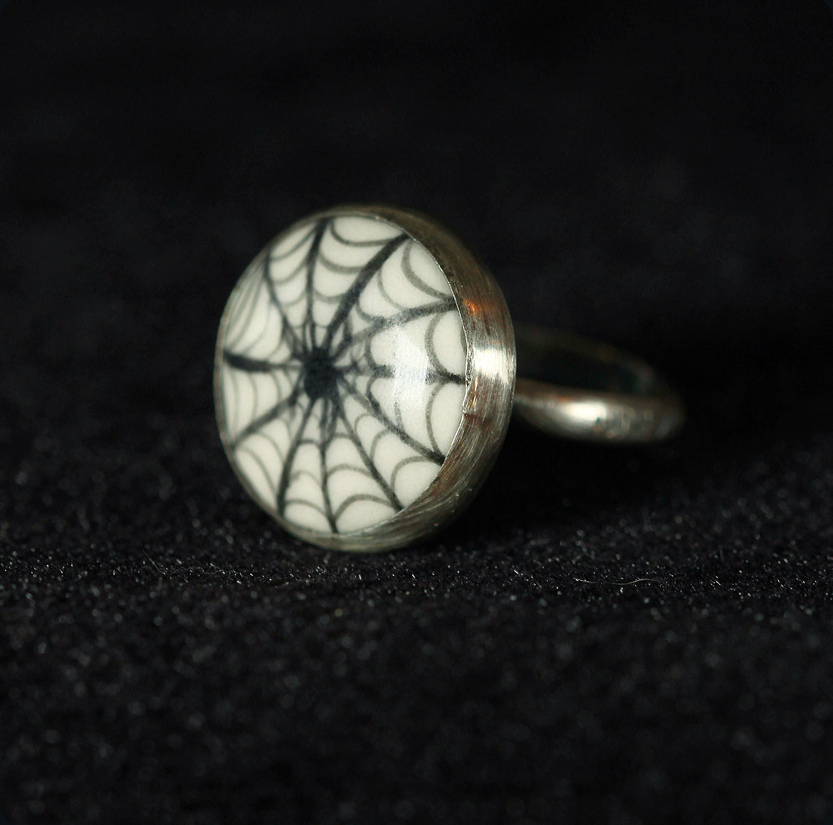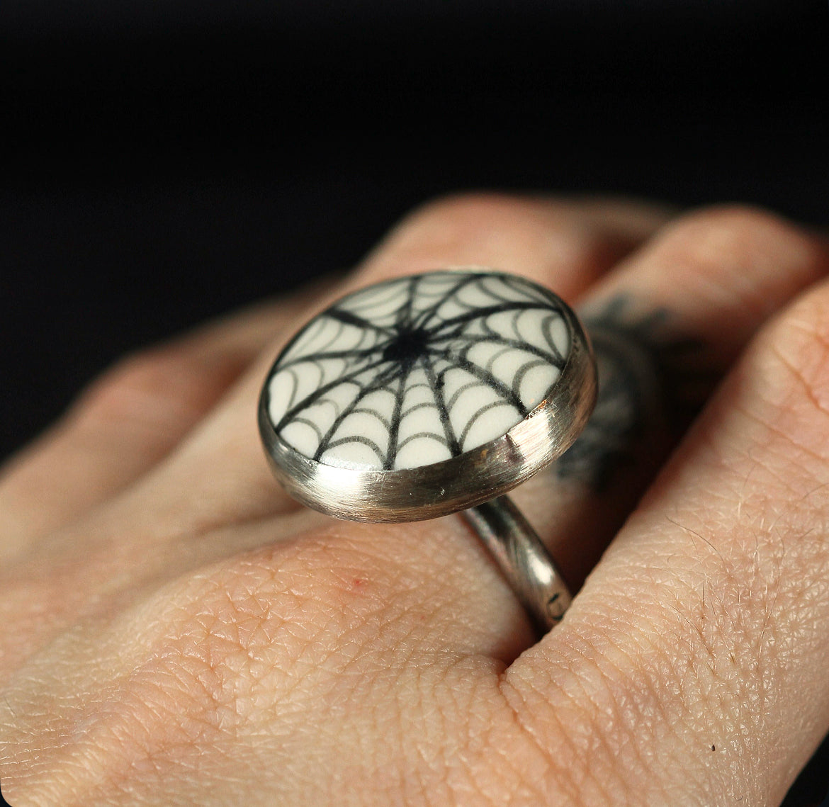 A delicate spider web, hand-painted on porcelain and framed in oxidized silver a quiet trap for beauty itself.